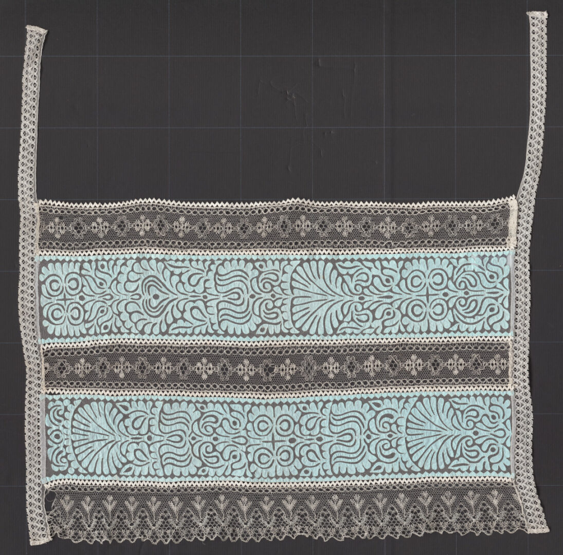 Časť dlhej šatky je z jedného konca a pôvodne tvorila ozdobnú časť celej dlhej šatky. Zošitá je z paličkovanej vláčkovej čipky a aplikácie na bavlnenom tyle. Štylizovaný rastlinný ornament je vystrihnutý z tenkého plátna zafarbeného modričkou na bledomodro. Prišitý je na tyl obrubovacím stehom. S čipkou sú aplikované časti spojené pomocou zúbkov ušitých z úzkej bielej stužky. Po bočných stranách časti šatky je našitá užšia továrenská čipka.