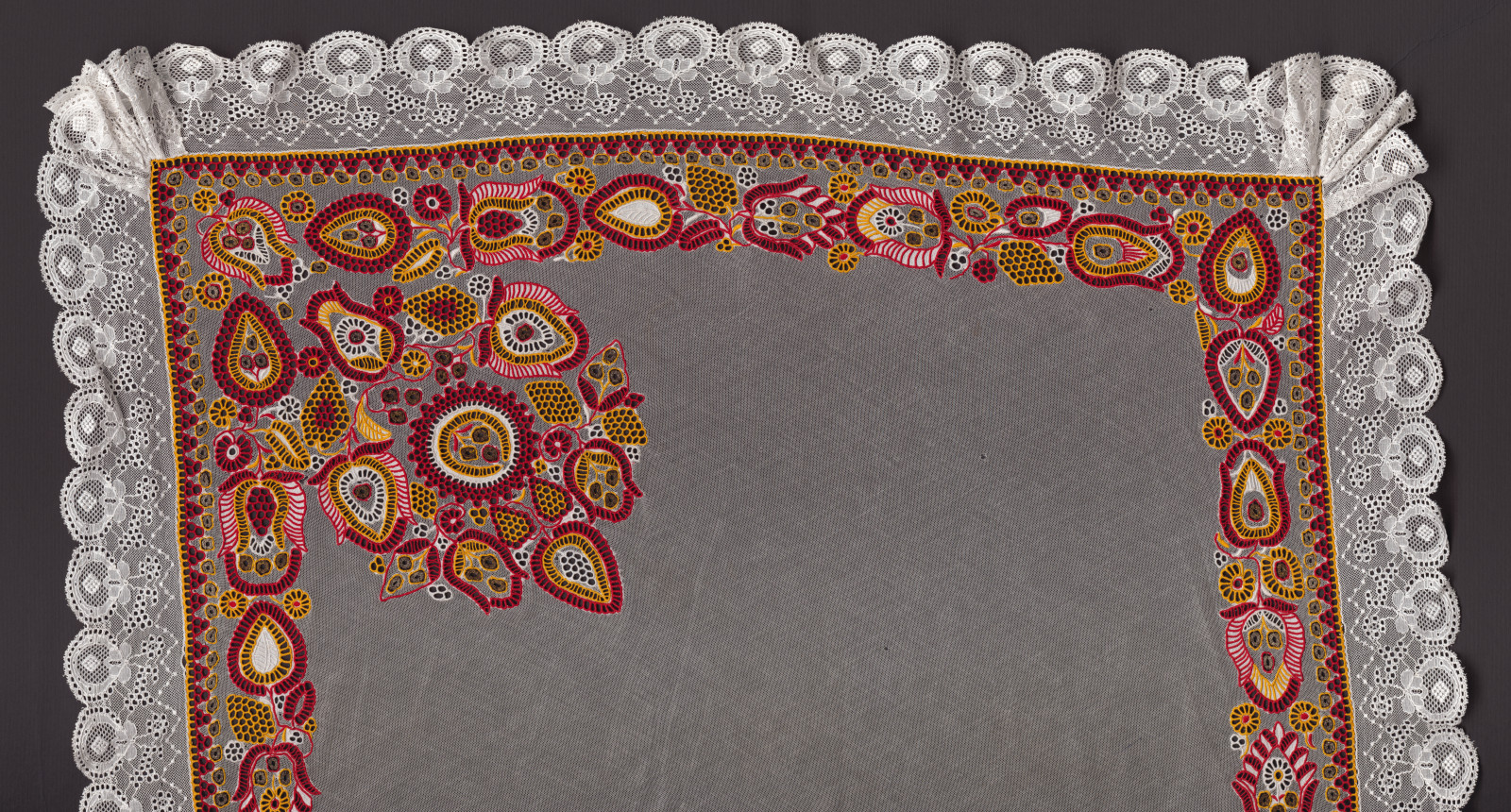 Šatka z bavlneného tylu má dookola a v dvoch protiľahlých rohoch výšivku. Dierková výšivka je podkladaná plátnom, väčšie dierky sú vyplnené gatrami. Výšivka je šitá bavlnenou priadzou, gatry sú robené kovovou niťou. Dookola je prišitá továrenska čipka, široká 10 cm.