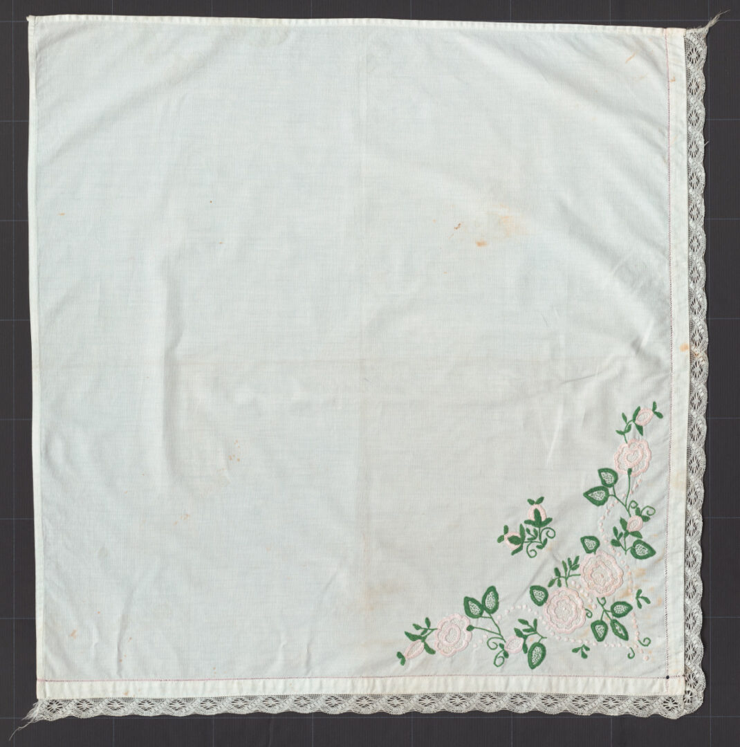 Šatka z továrenského plátna má v jednom rohu umiestnenú predkreslenú výšivku. Vyšitá je bavlnenou vyšívacou priadzou. Použitý je stonkový, slučkovací a plný steh. Priľahlé dve strany šatky sú zapracované ažúrkou a olemované bavlnenou továrenskou čipkou.