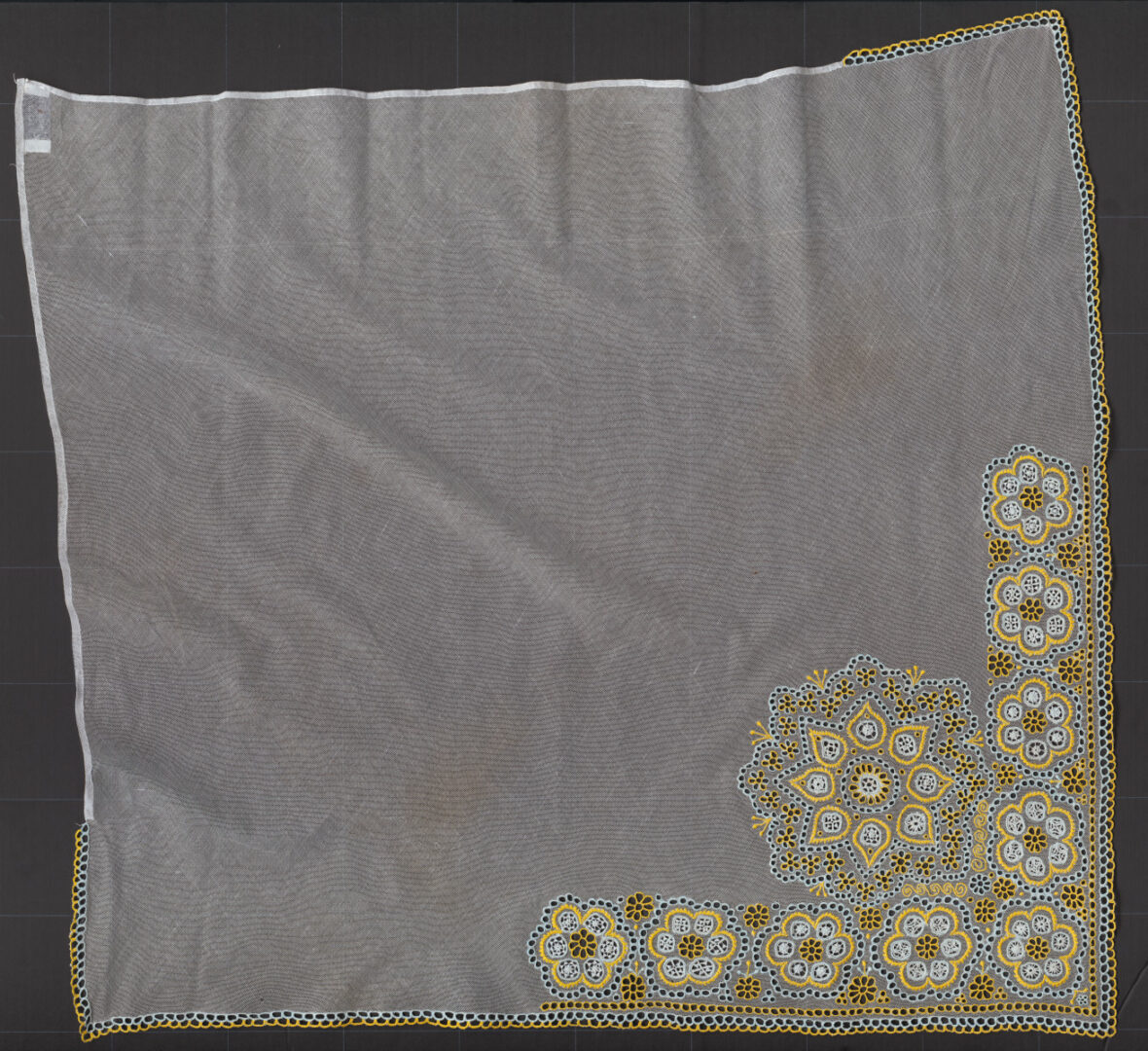 Šatka I z bavlneného tylu má v jednom rohu dierkovú výšivku s gatrami. Výšivka je šitá bavlnenou priadzou, podkladový materiál je továrenské plátno. Šatka mala priľahlé strany vyšitého rohu pôvodne olemované čipkou.