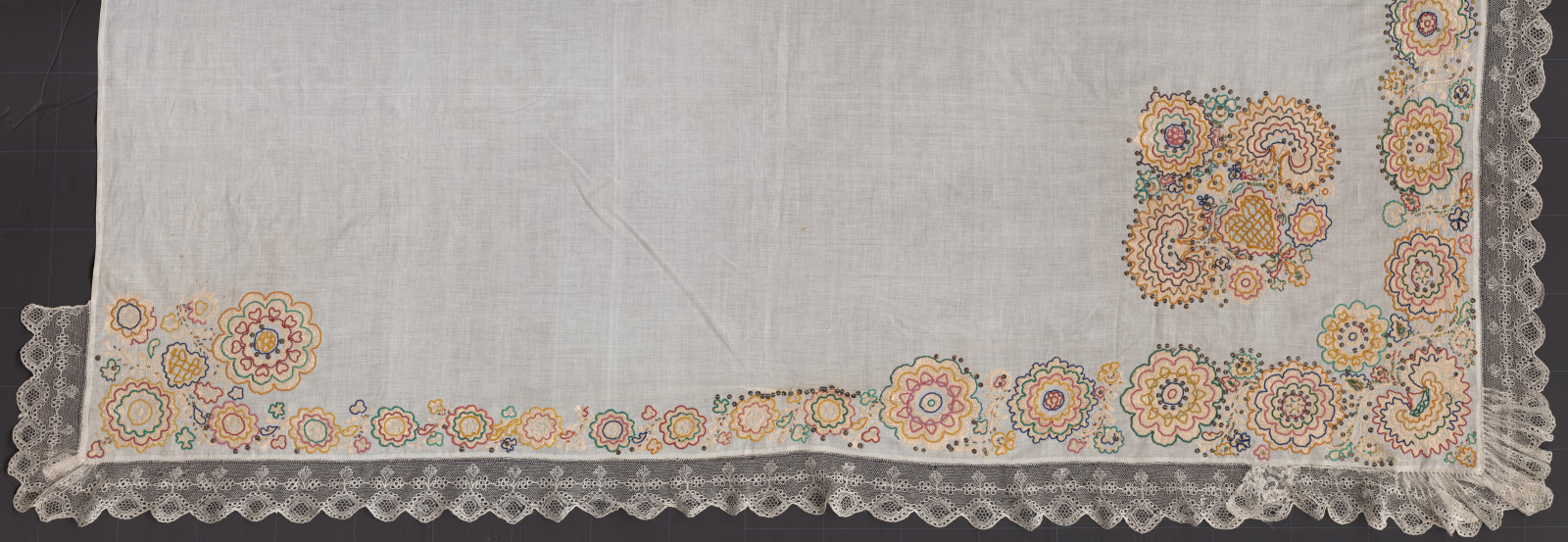 Šatka z bavlneného šifónu má dva priľahlé okraje a tri rohy olemované vláčkovou paličkovanou čipkou. Tie isté okraje a rohy sú ozdobené predkreslenou výšivkou, ktorá je šitá hodvábnou priadzou. Použitý je plný úsporný steh. Motívy sú konturované našitými sklenenými korálkami rôznych farieb. Kompozíciu dopĺňajú našité flitre. Šatka bola pravdepodobne súčasťou odevu, ktorý nosili spišskí Nemci.