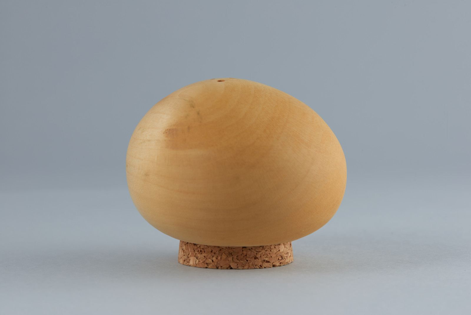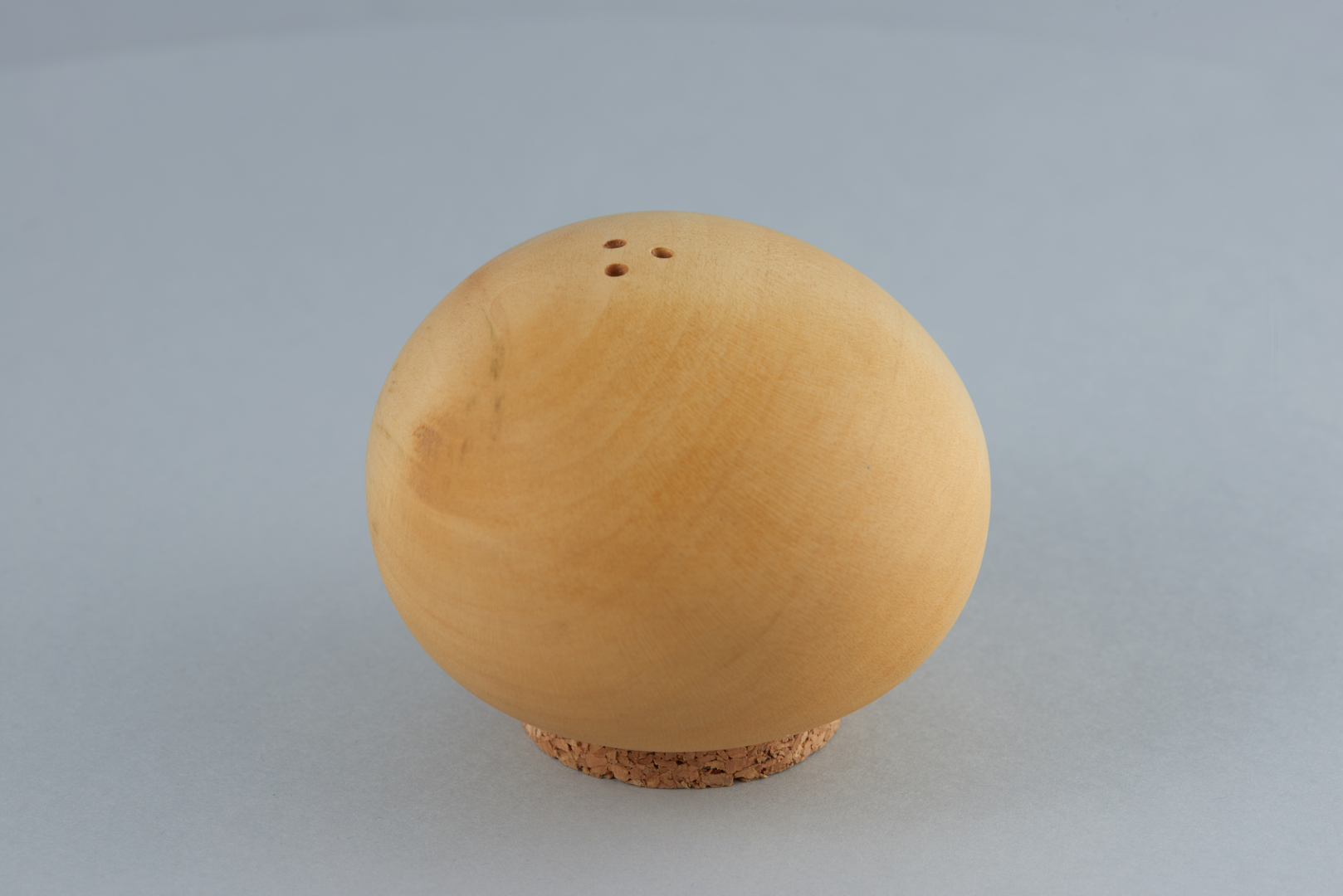 Soľnička tvaru sploštelej gule s hladkým povrchom, v spodnej časti násypný otvor uzavretý korkovou zátkou, vo vrchole trojica výsypných dierok.