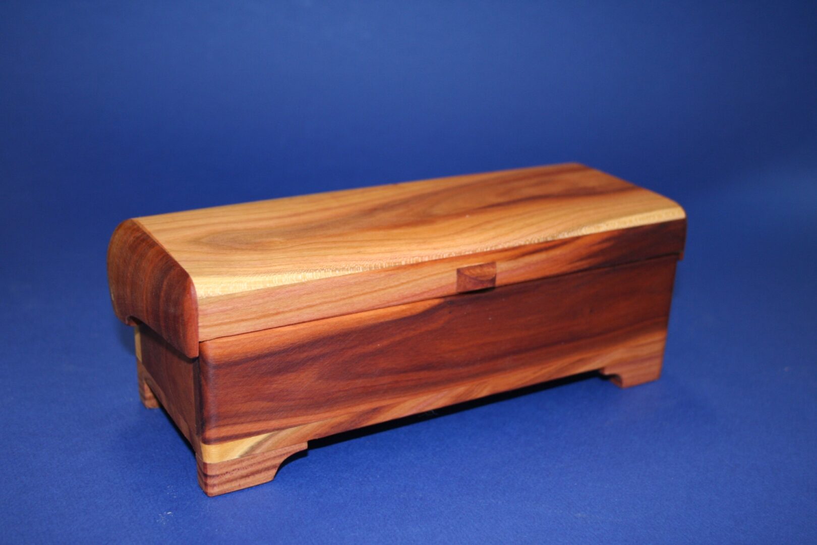 Drevená šperkovnica na nôžkach s vrchnákom môže byť vyhotovená z rôznych drevín. Je do hladka opracovaná a povrch je ošetrený jemnou vrstvou ľanového oleja.