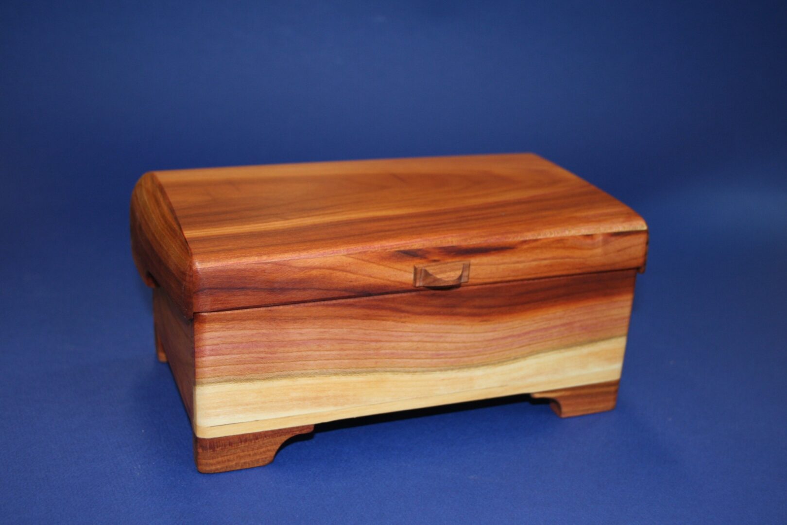 Drevená šperkovnica na nôžkach s vrchnákom môže byť vyhotovená z rôznych drevín. Je do hladka opracovaná a povrch je ošetrený jemnou vrstvou ľanového oleja.