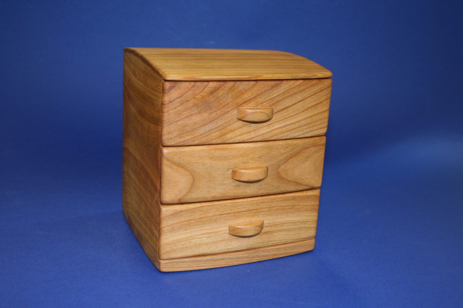 Drevená šperkovnica s 3 zásuvkami môže byť vyhotovená z rôznych drevín. Je do hladka opracovaná a povrch je ošetrený jemnou vrstvou ľanového oleja.