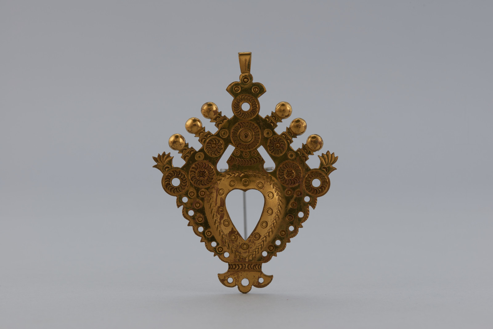 Spinka mosadzná, tepaná v tvare ozdobne profilovaného kosoštvorca so stredovým otvorom v tvare srdca. Horná časť ozdobne tvarovaná v podobe drobných tykadiel s bodkami na koncoch. Mosadzná spinka ždiarskeho typu, trojlopatková, upravená na zachytenie retiazkou. Zdobená prerezávaním a raznicami.
