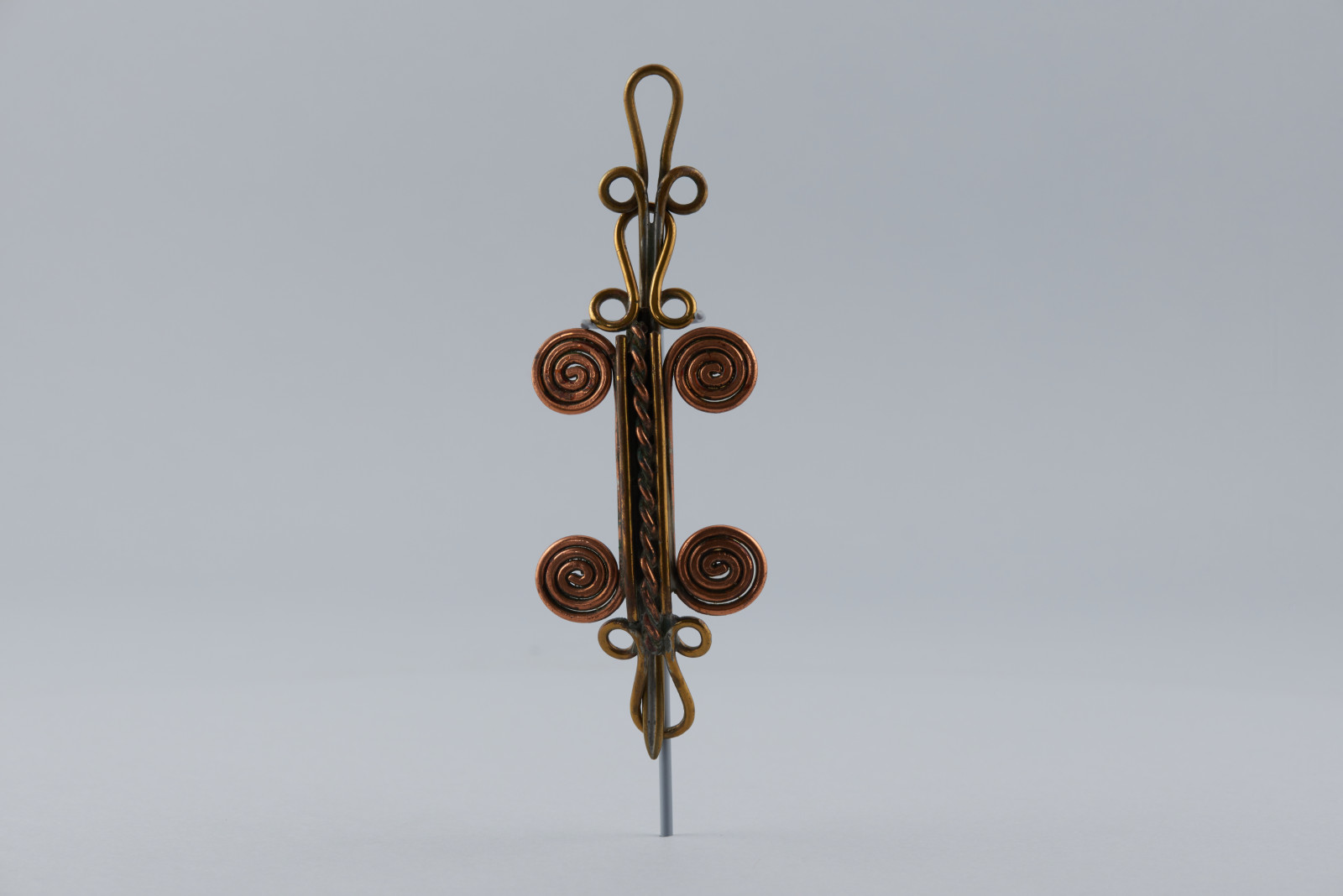 Spona do vlasov kovová, stáčaná z mosadzného a medeného drôtu do štyroch meandrov, spojená letovaním. Stočené mosadzné a medené drôty, spojené cínovaním. Ihlica z medeného drôtu, vyvedená z ihlice do fajky.