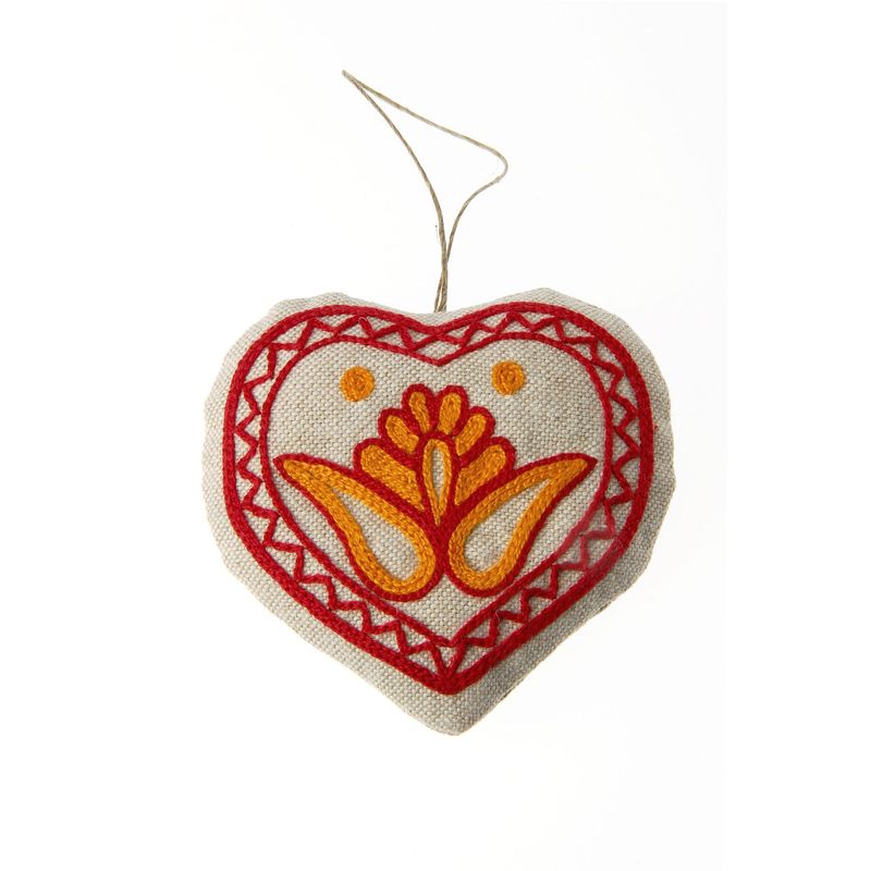 Srdiečko je závesné, vyšité retiazkovým stehom krivou ihlou a naplnené levanduľou. Na výzdobu je použitý vyšívací vzor z Detvy.