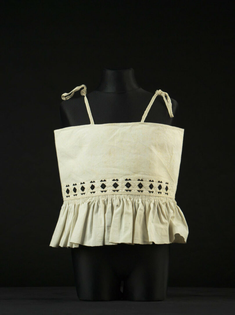 Stanka z domáceho bavlneného plátna má na zadnej časti nad pásom umiestnenú výšivku, ktorá je šitá podľa počítania nití. Použité stehy: hladkovanie, krokvička. K stanke je prišitý pás plátna, ktorý je v zadnej časti nariasený v páse. K stanke sú prišité cigánske tkanice, tvoria ramienka.