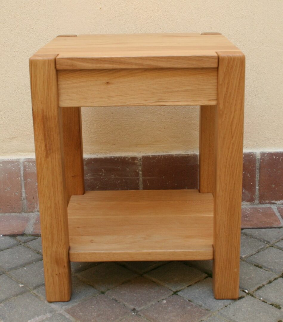 Stolček drevený s poličkou má štvorcový tvar a je vyrobený z dubového dreva. V spodnej časti stolčeka je umiestnená polička na odkladanie vecí. Povrch stolčeka je ošetrený akrylovým lakom.