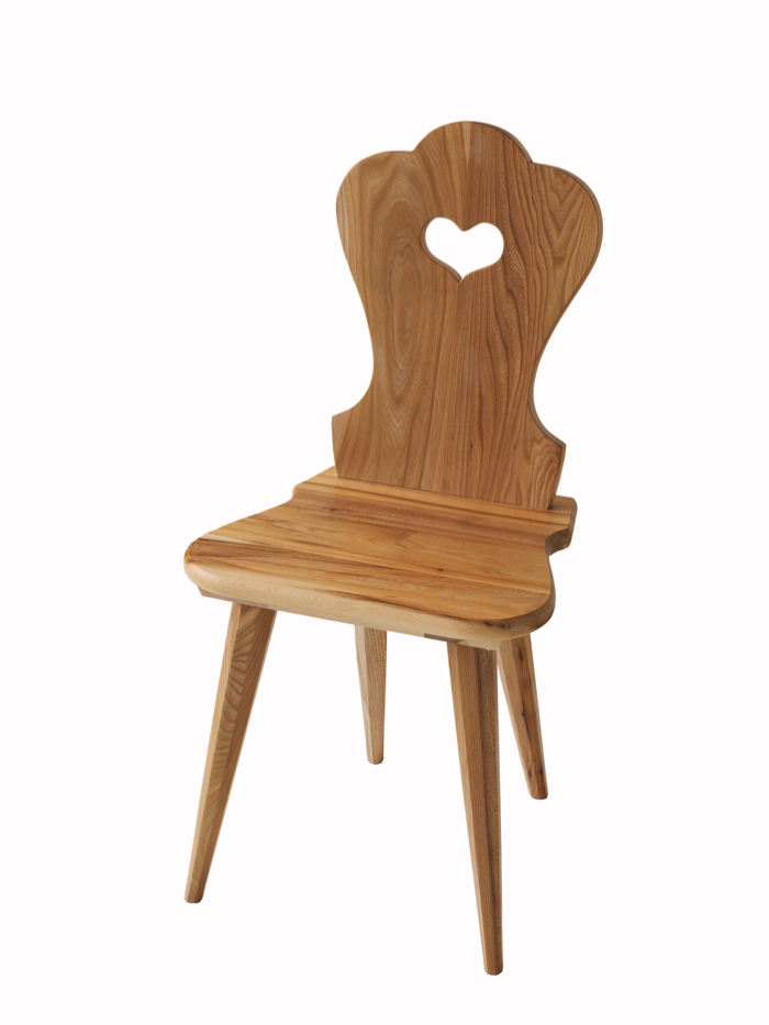 Stolička drevená ľudová je vyhotovená v prírodnom prevedení. Operadlo je ozdobne vyrezávané so srdiečkom. Nohy sú šikmo vsadené do štvorcového sedadla.