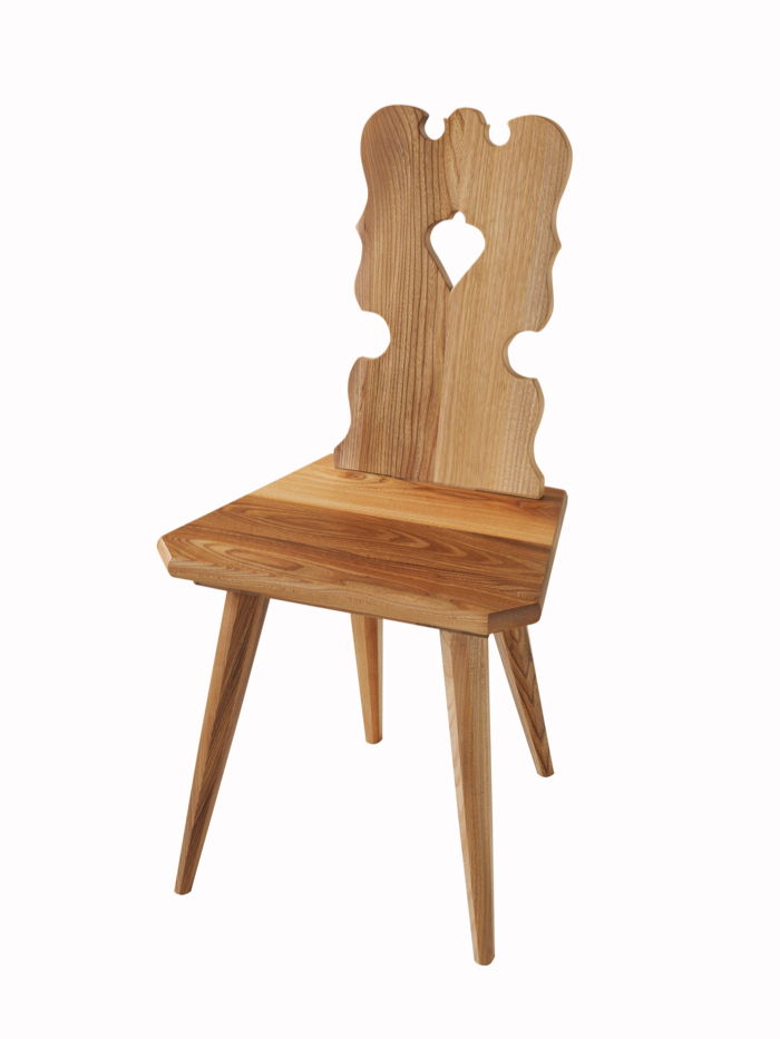 Stolička drevená ľudová je vyhotovená v prírodnom prevedení. Operadlo je ozdobne vyrezávané so srdiečkom. Nohy stoličky sú šikmo vsadené do sedadla štvorcového tvaru.