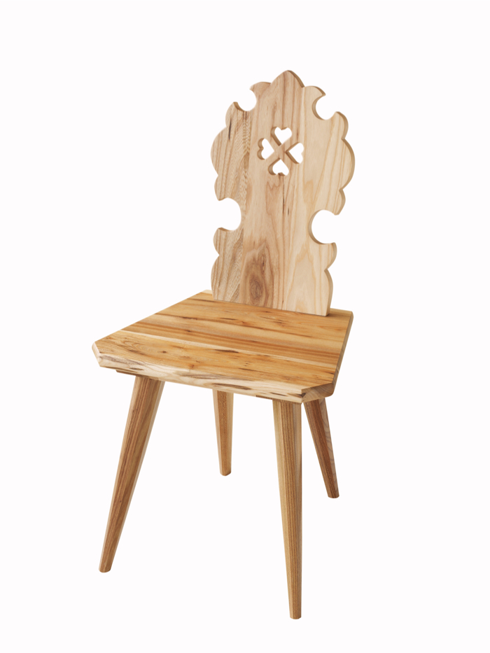 Stolička drevená ľudová je vyhotovená v prírodnom prevedení. operadlo je ozdobne vyrezávané. Nohy stoličky sú šikmo vsadené do sedadla štvorcového tvaru.