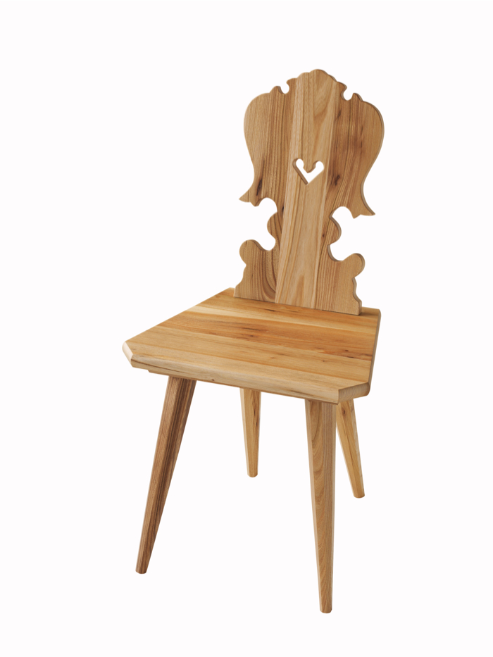 Stolička drevená ľudová je vyhotovená v prírodnom prevedení. Operadlo je ozdobne vyrezávané so srdiečkom. Nohy stoličky sú šikmo vsadené do sedadla štvorcového tvaru.