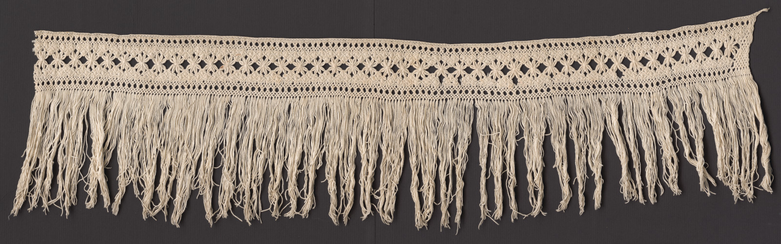 Ozdobne viazané strapce zhotovené z bielych bavlnených nití samostatne bez tkaniny. Strapce majú tri rôzne typy viazania, motívy predstavujú kvety a kosoštvorce. Na jednom kuse je časť visiacich strapcov odstrihnutá. Získané zo Spolku pre zveľaďovanie domáckej výroby.