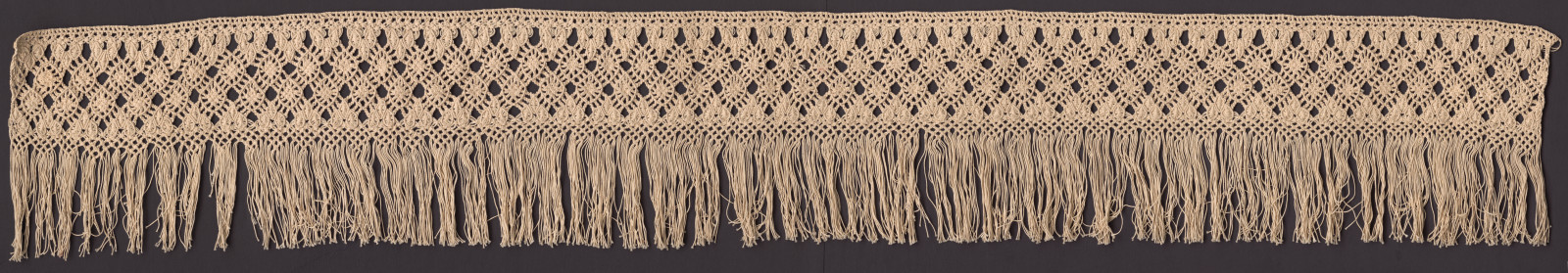 Ozdobne viazané strapce zhotovené z bavlnených nití béžovej farby. Zhotovené sú samostatne, bez nosnej tkaniny a viazané sú do zložitých geometrických motívov. Dĺžka strapcov je 22 cm (12,5+9,5 cm). Získané zo Spolku pre zveľaďovanie domáckej výroby.