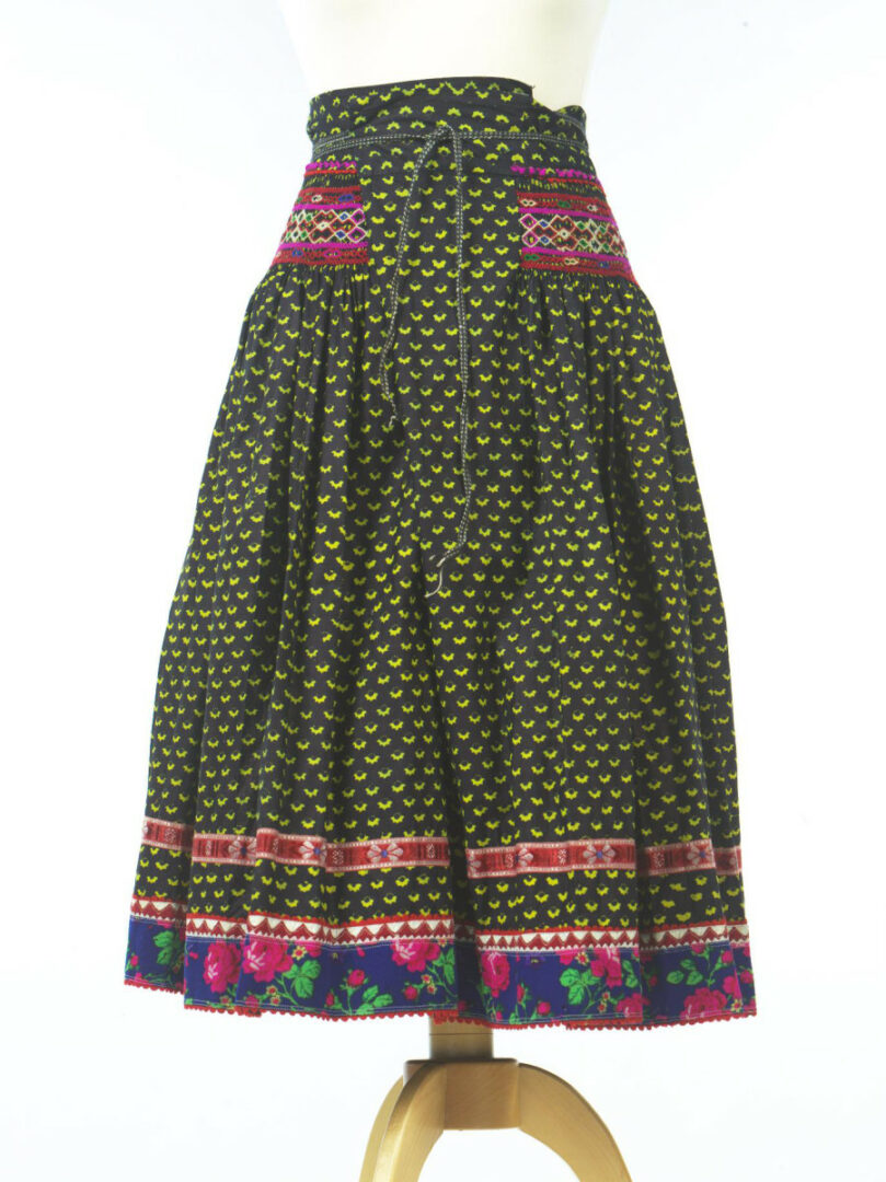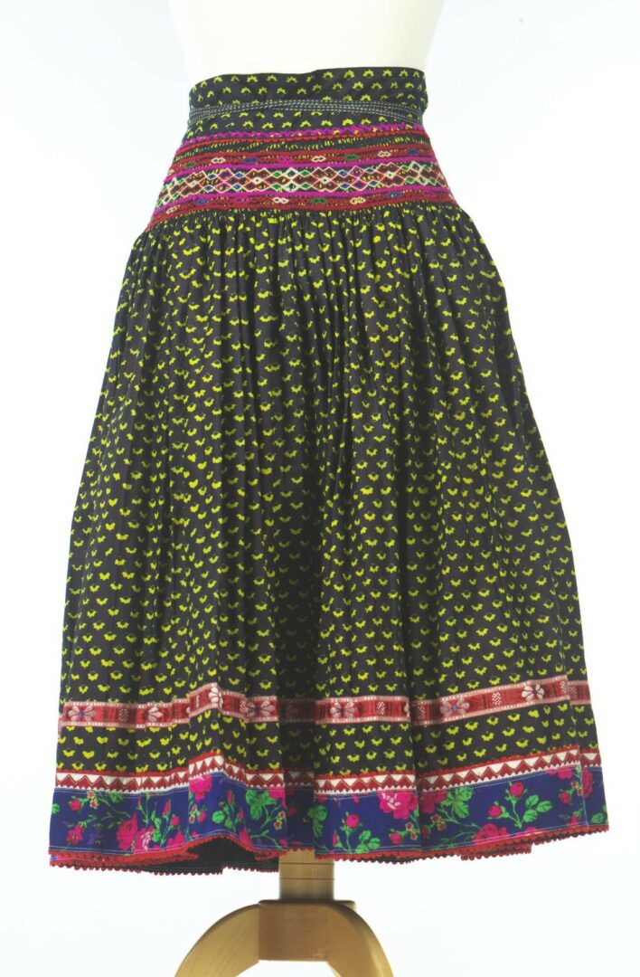 Sukňa je z piatich pôl modrotlače, tlačenej na továrenskom plátne. Na dolnom okraji je našitý pás vzorovaného kašmíru a pásik plátna, na ktorom sú našité zúbky z červeného plátna. Nad kašmírovým pásom je našitá červená vzorovaná stuha. Horná časť je nariasená a riasenie je spevnené pomerne širokou výšivkou. Výšivka je urobená vlnenou priadzou. Sukňa je všitá do obalka z modrotlače, ktorý je podšitý továrenským plátnom. K obalku sú prišité cigánske tkanice.