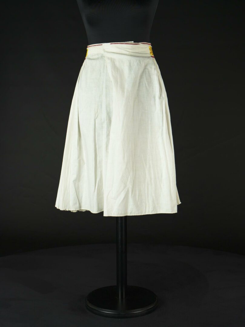 Sukňa je ušitá z 8 lichobežníkov továrenského plátna, deviata, predná pola, je obdĺžniková, v strede má rozparok. V páse je sukňa nariasená, cez riasenie je urobená výšivka. Nad výšivkou je sukňa všitá do obalka, z ktorého je len malá časť na lícovej strane, väčšia časť je z rubu. Dolný okraj sukne je ručne obrúbený.