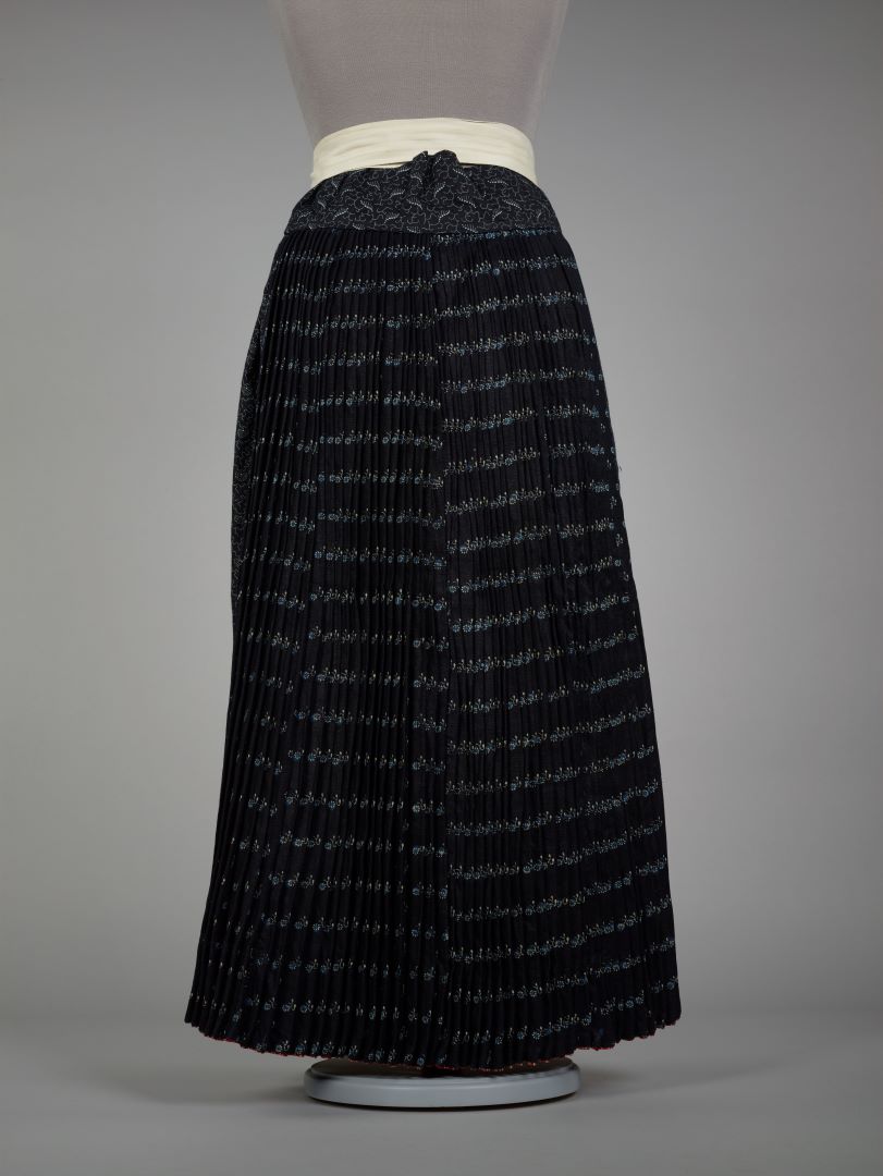 Sukňa je z piatich pôl modrotlače. Štyri poly sú z modrotlače tlačenej na domácom plátne, piata, predná pola je z modrotlače tlačenej na bavlnenom továrenskom plátne. Z tejto modrotlače je aj obalok. Podšitie dolného okraja je z kockovaného červeno-bieleho kanafasu. Sukňa je, okrem prednej poly, naskladaná do ležatých záhybov. Sukňa je ušitá čiastočne ručne, čiastočne strojom.