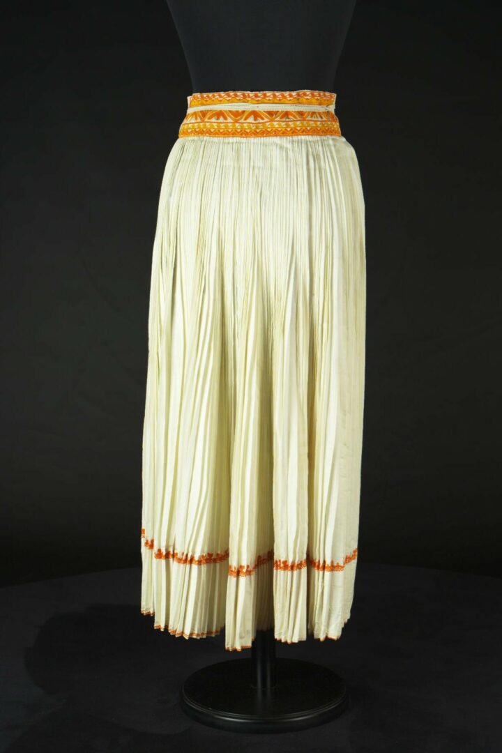 Ženská sukňa „kynteš“, zhotovená z bieleho perkálu, obalok z hrubšieho ľanového plátna. Obalok je vyšívaný krivou ihlou bavlnenou priadzou oranžovej, žltej a modrej farby. Na spodnom okraji sukne len oranžovou farbou. Viazačky sukne sú cigánske tkanice z nebielených ľanových nití.