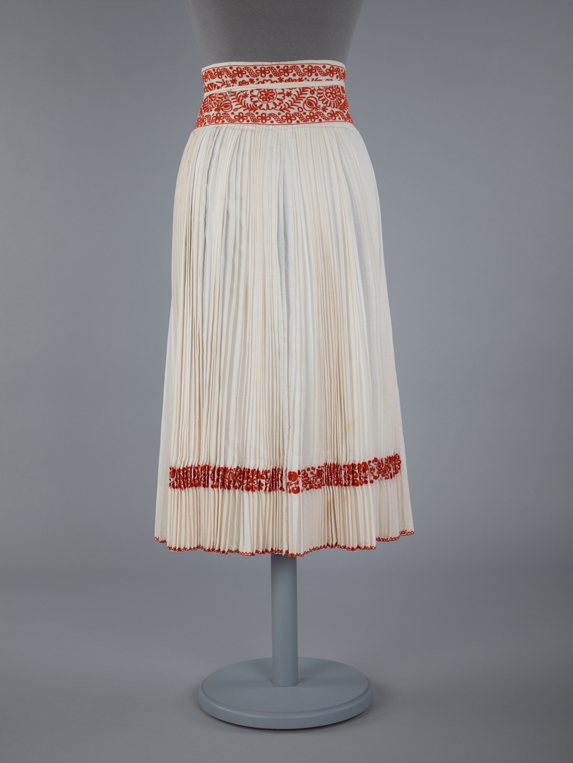 Ušitá je z piatich pol bieleho batistu. Na zadnej časti obalku a na dolnej časti sukne je výšivka krivou ihlou.Šitá je perlovkou. Sukňa je okrem prednej poly naskladaná do ležatých záhybov.
