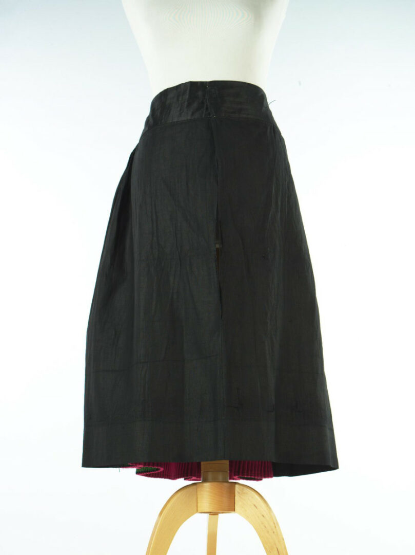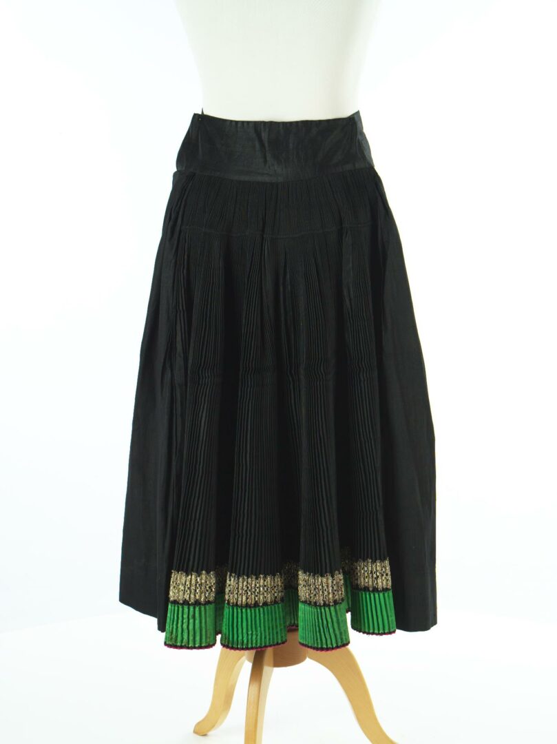 Sukňa je ušitá z bavlneného glotu, prednú polu má z čierneho továrenského plátna. Dolný okraj, okrem prednej poly, má podšitie z tmavoružového glotu. Nad okrajom je našitá hodvábna stuha a nad ňou strieborná paličkovaná čipka. Okrem prednej poly je celá sukňa naplisovaná a všitá do širokého obalka. K obalku je prišitá čierna keprovka, na uviazanie sukne v páse.