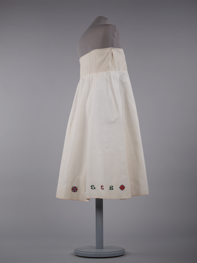 Spodná sukňa sa skladá zo samotnej sukne a stanky. Sukňa je ušitá zo 6 lichobežníkových častí domáceho bavlneného plátna, ku ktorej je prišitá stanka, pás pravdepodobne bavlneno-konopného plátna. Na dolnej časti sú vyšité geometrické motívy a písmená, pravdepodobne meno majiteľky. Použitý je krížik, hladkovanie a zadný steh.