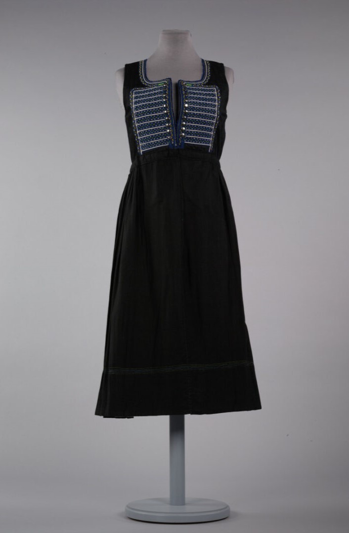 Sukňa je ušitá z čierneho glotu, dolný okraj má z rubovej strany podšitý pásikovým perinovým kanafasom. Nad podšitím je sukňa preštepovaná strojom, žltou a modrou niťou. Okrem prednej časti je celá sukňa naskladaná do jednostranných záhybov a všitá do obalka. Živôtik je z čierneho glotu, podšitý je bavlneným plátnom. Ozdobený je šnurovaním modrým šujtášom, dopĺňajú ho jednoduché stehy výšivky. Šujtáš je prišívaný strojom. Okolo výstrihu a predných dielov je prišitá modrá hadovka. Na predných dieloch sú šesťhranné kovové gombíky striebornej farby. Živôtik sa zapína na dva kovové háčiky prišité nad pásom. Živôtik je ručne zošitý so sukňou.