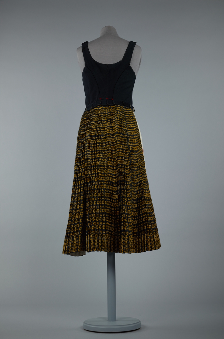 Živôtik je ušitý z tenkého továrenského súkna, podšitý je ľanovým plátnom. Na predných dieloch sú vyšité dierky vlnenou priadzou. Kovové gombíky majú v strede červené sklíčko. Sukňa je z modrotlače tlačenej na domácom plátne. Prednú polu má z domáceho plátna, pretkaná je tromi červenými pásmi. Po dĺžke je naskladaná podľa vzoru, sklady sú z rubovej strany prichytené domácou priadzou. Dolný okraj je z rubu podšitý hrubým domácim plátnom.