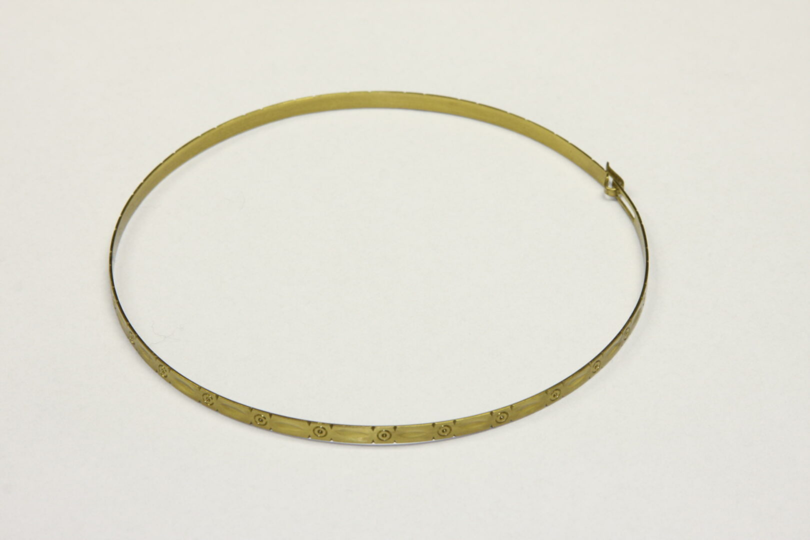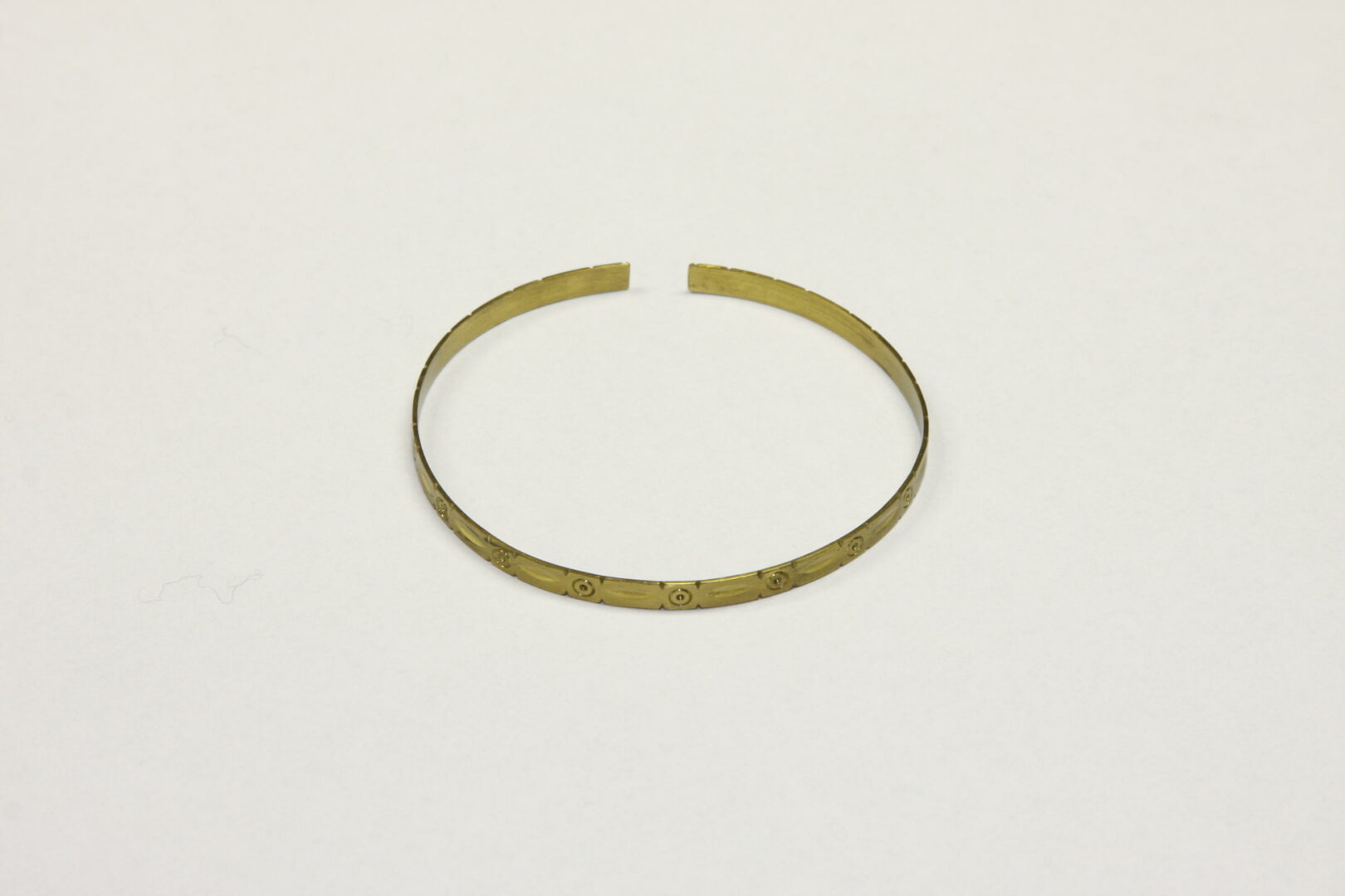 Súprava šperkov – náhrdelník, náramok, prsteň z mosadze s geometrickými pravidelnými zárezmi po obvode a kružnicovými raznicami na ploche. Prsteň má iba jeden kružnicový dekor.