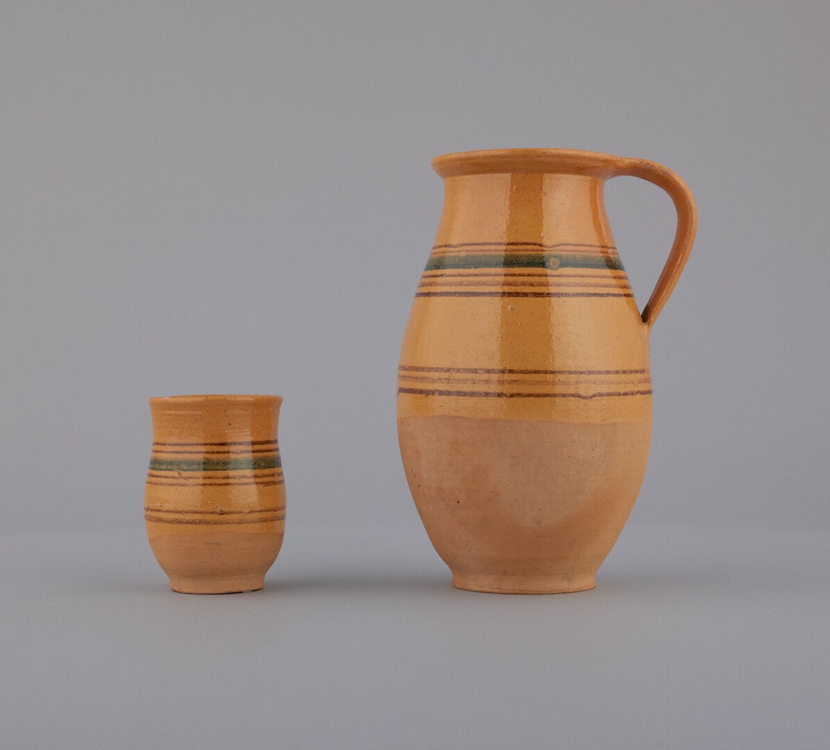 Mliečnika a poháre z bledej hliny, točené na kruhu. Mliečnik: výduť pod polovicou výšky, dno užšie ako hrdlo, vyhnutý okraj, ucho vychádza od okraja. Poháre: úzke dno, hrdlo širšie, výduť asi v polovici výšky. Dekor. Na výduti a pod hrdlom obvodové čiary a pásy. Farebnosť: hnedá a modrá. Žltá priehľadná glazúra. Na dne mliečnika ryté zn. H, S, 9.