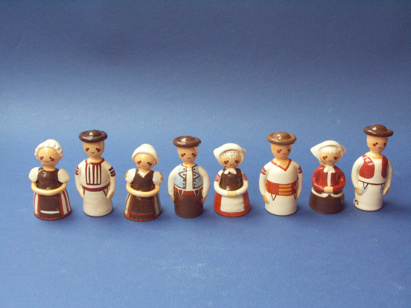 Figúrky štylizované krojované – koledníci – základný tvar je točený na hrnčiarskom kruhu, farbené farebnými engobami, transparentná bezfarebná glazúra. Rôzne varianty.