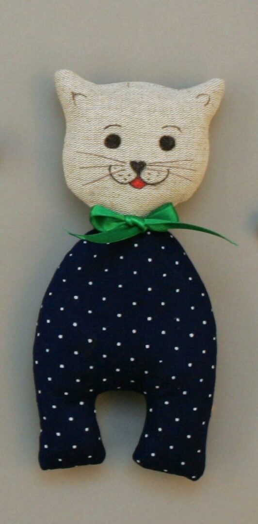 Textilné zvieratko – mačka je vyrobená zo 100% bavlnenej látky v kombinácii s modrotlačou, vyplnená dutým vláknom.