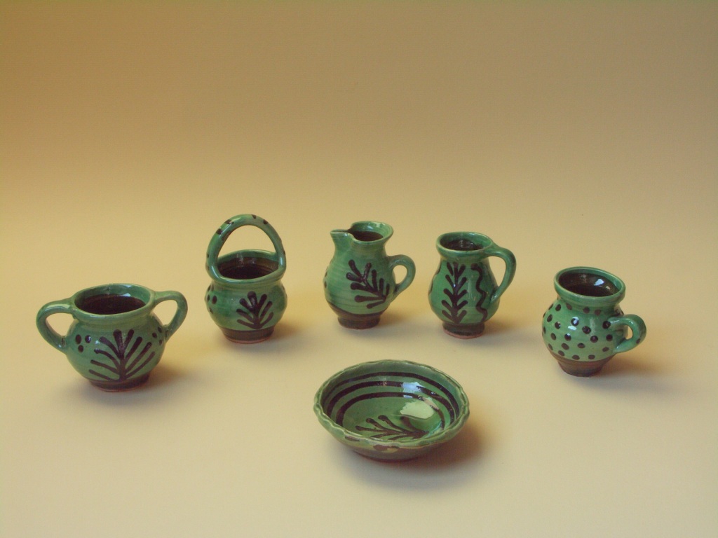 Ručne točené na hrnčiarskom kruhu, ušká lepené šlikrom, poliate bielou hlinkou maľovaný pomocou pomocou kukučky zväčša tmavohnedou hlinkou geometrický dekor, transparentná bezfarebná, alebo zelená glazúra. Rôzne tvary a vzory.