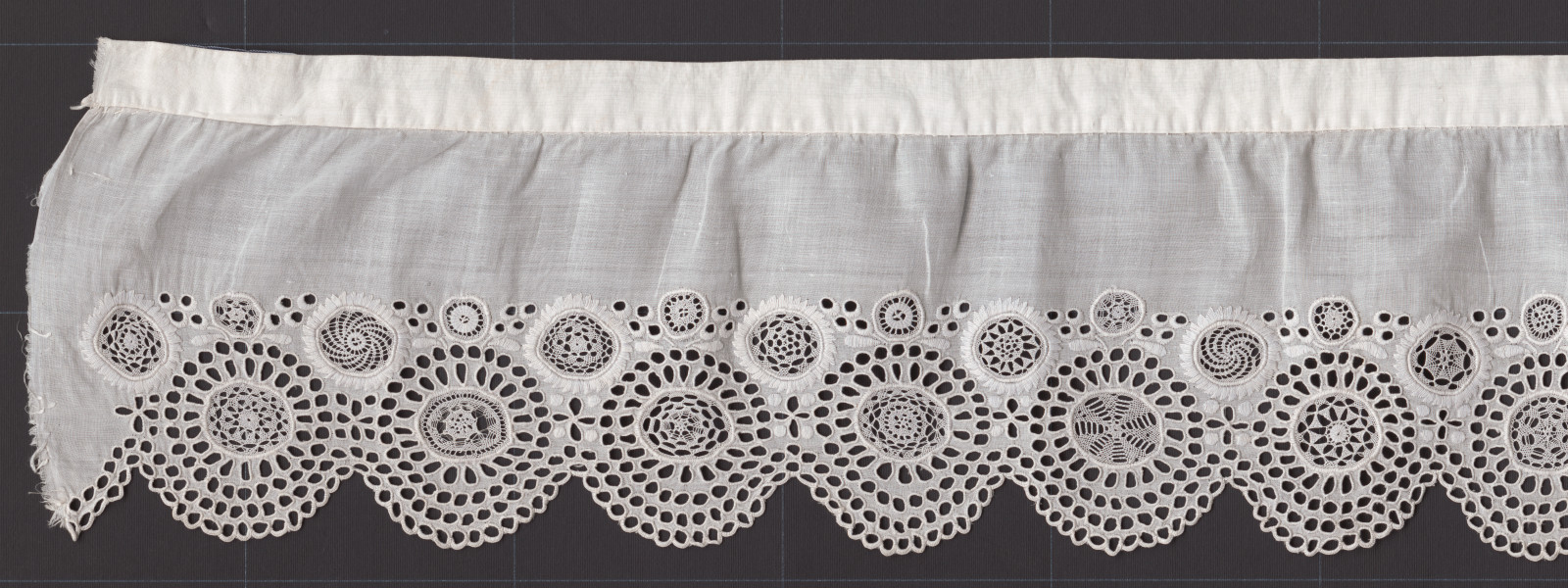 Tacla je zhotovená z batistu, na ktorom je výšivka, biela dierková, doplnená gatrami.