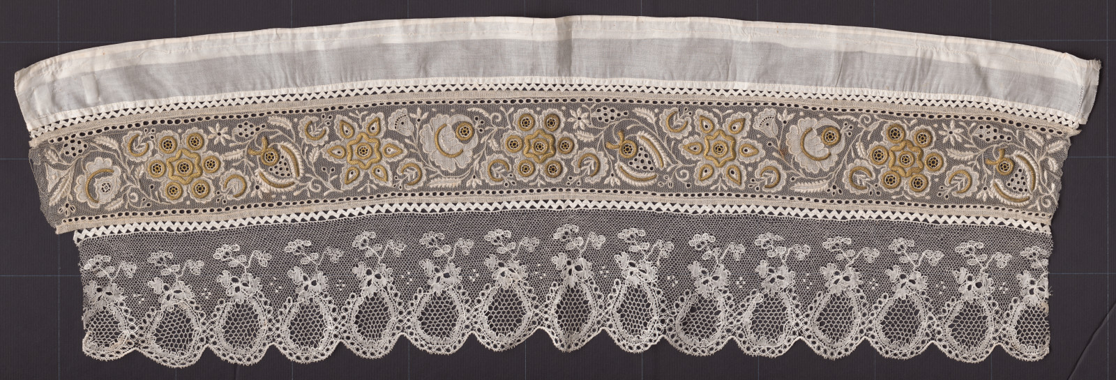 Zhotovené sú z troch pásov, prvý je z vaperu, druhy je z tylu, na ktorom je výšivka podkladaná a nášivka zlatou niťou cez kartón a tretí tvorí paličkovaná vláčková čipka. Vyšívaný rastlinný ornament je šitý naplno, dierkami a gatrami. Pásy sú zošité za pomoci zúbkov.