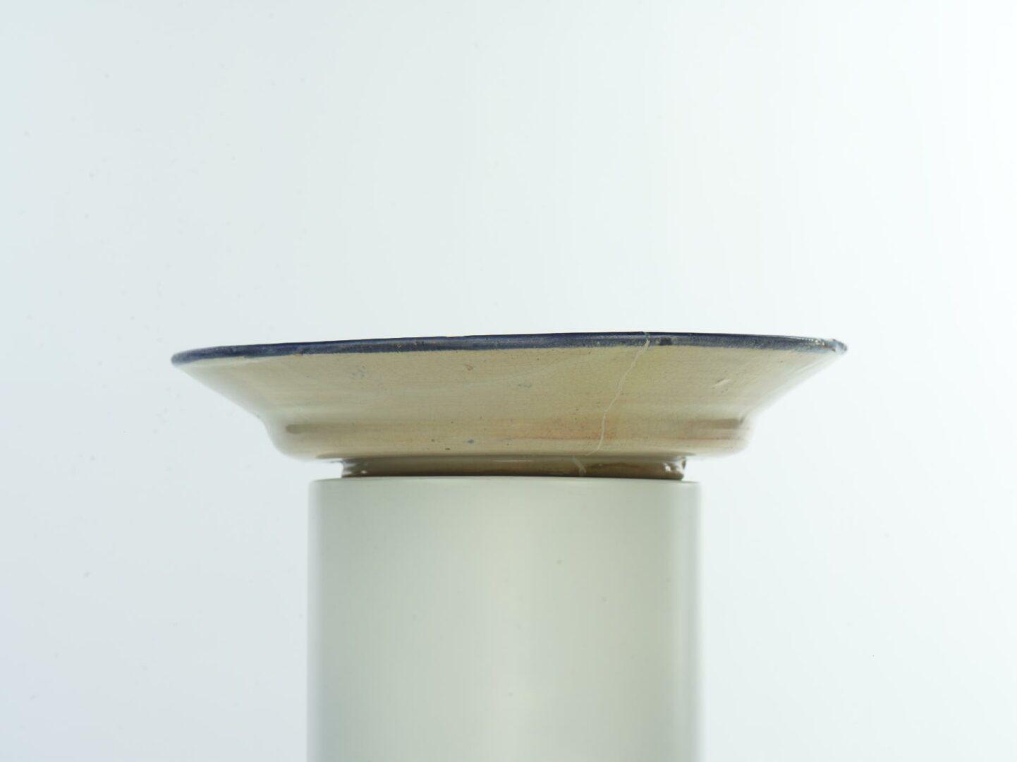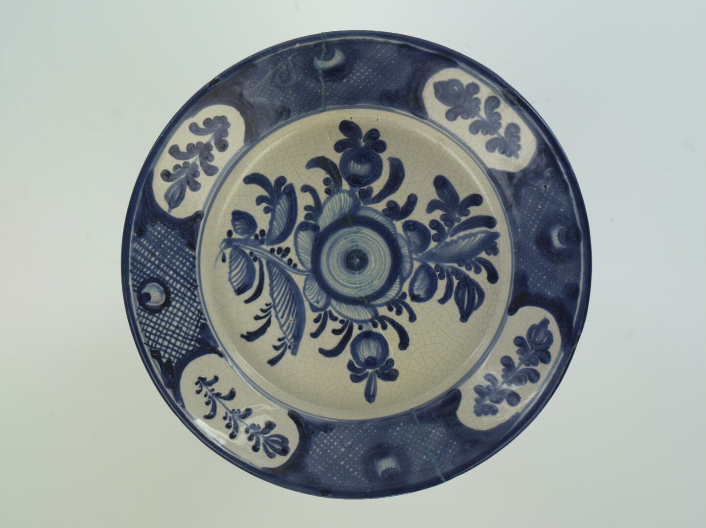 Tanier z bledej hliny, točený na kruhu. Nízke steny sú pod okrajom mierne vyhnuté. Dekor: kvetinový, v strede veľká ruža, okolo puky, po obvode stiedavo mriežka a rastlinný dekor /mykáče/. Farebnosť: modrá, biela podkladová glazúra. Bez značenia.