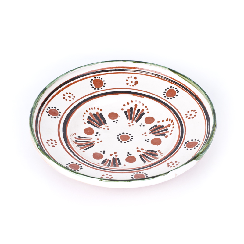 Ručne točený na hrnčiarskom kruhu, poliate bielou hlinkou, zdobený červenohnedou a tmavohnedou hlinkou geometrickým dekorom.