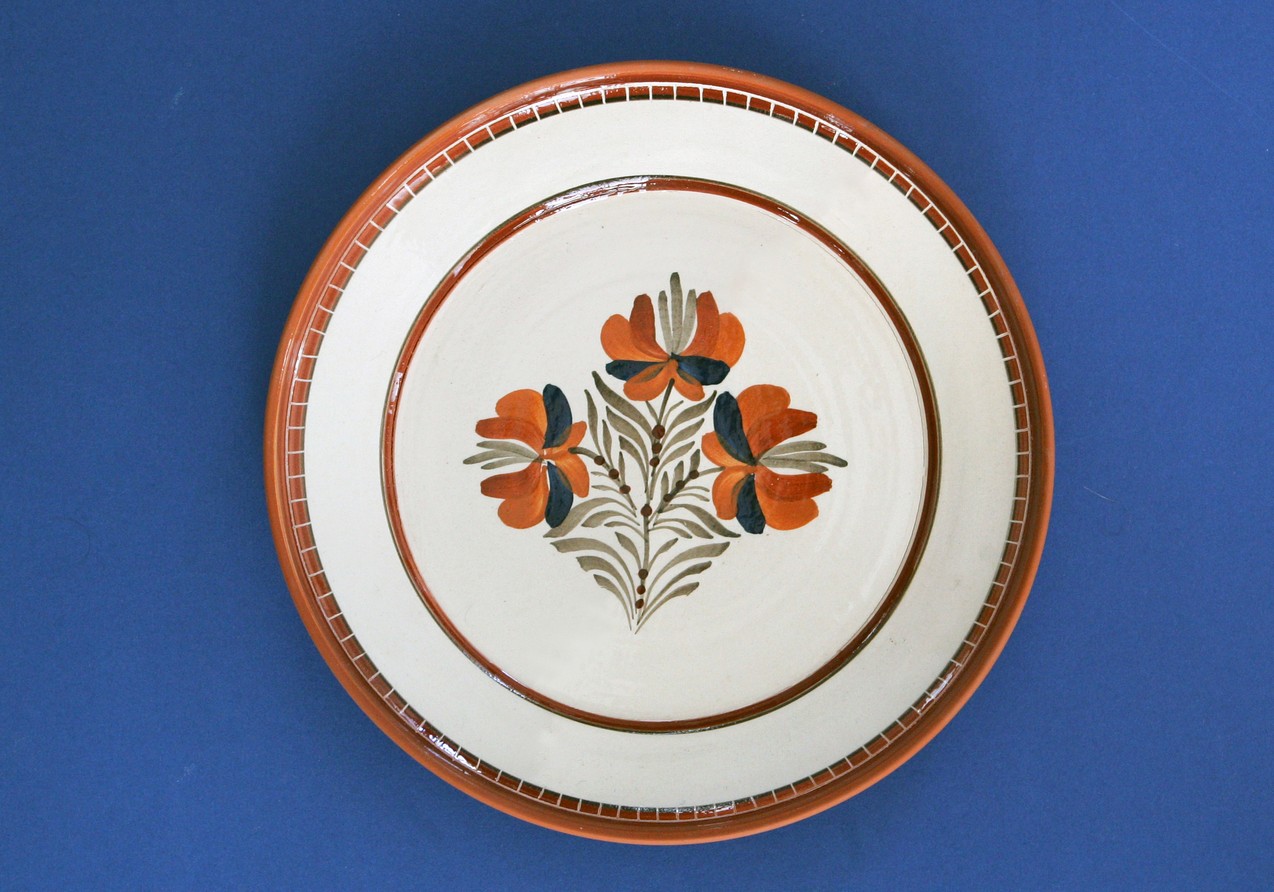 Ručne točený na hrnčiarskom kruhu, zvnútra vyliaty bielou hlinkou, po obvode a na dne maľovaný a rytý geometrický a rastlinný dekor, transparentná bezfarebná glazúra.