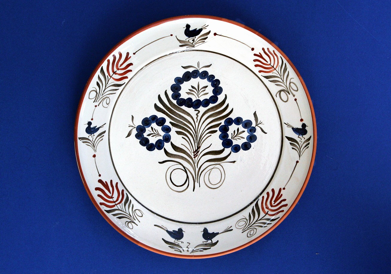 Ručne točený na hrnčiarskom kruhu, poliaty bielou hlinkou, maľovaný rastlinný motív s vtáčikmi po okraji, transparentná bezfarebná glazúra.