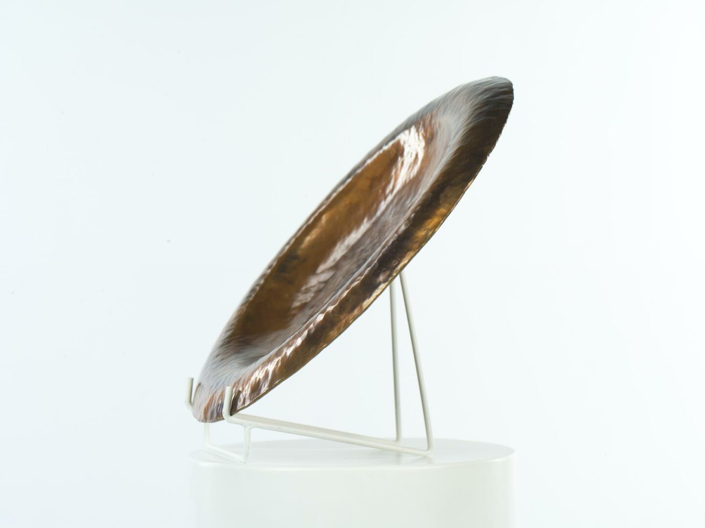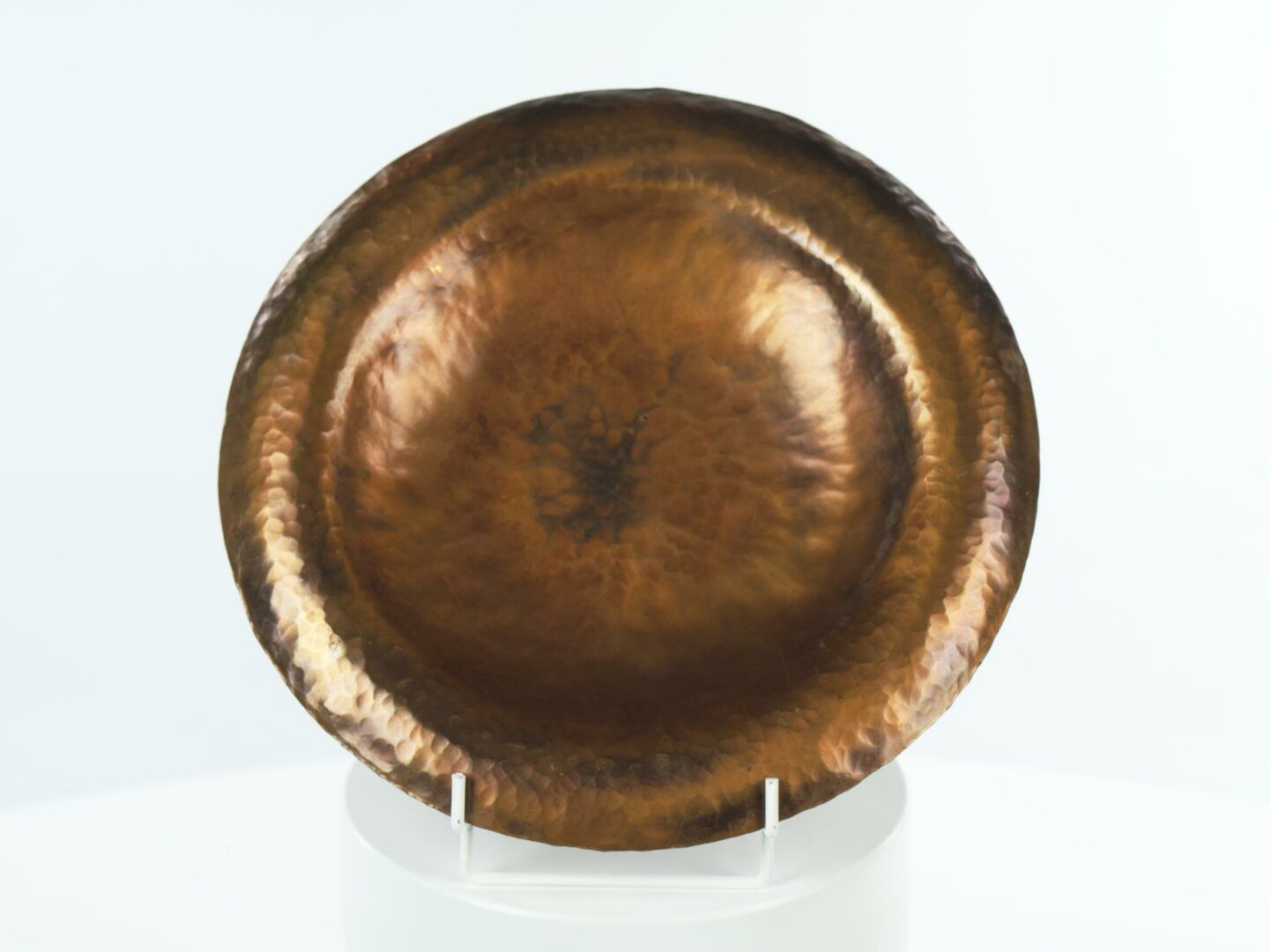 Kovaný medený tanier povrchovo upravený voskovaním.