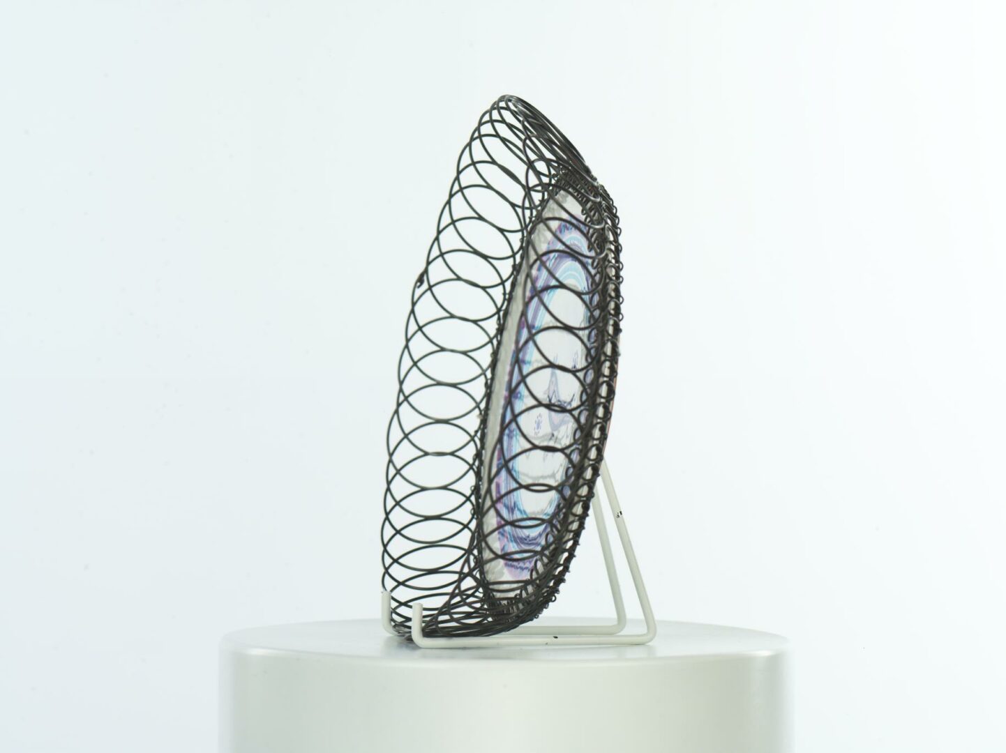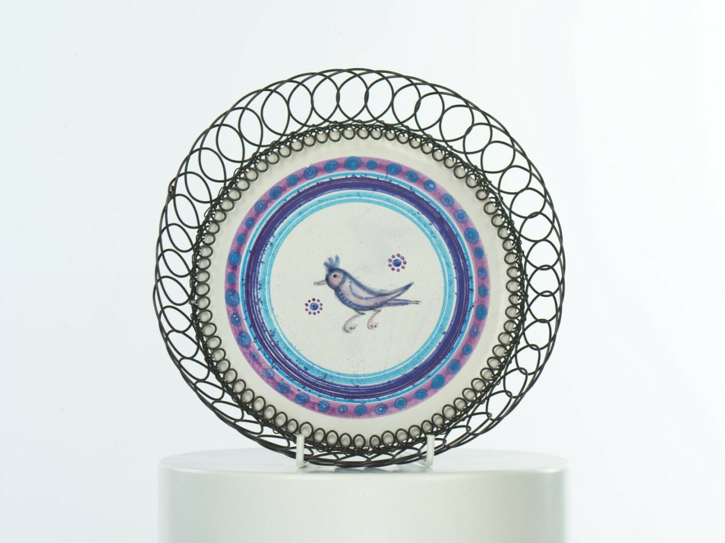 Tanier majolikový s drôteným okrajom. Dekor: na dne vtáčik, okolo pásiky. Okraj taniera dekoratívne odrôtovaný počierneným drôtom. Farebnosť: modrá, fialová. Biela glazúra.