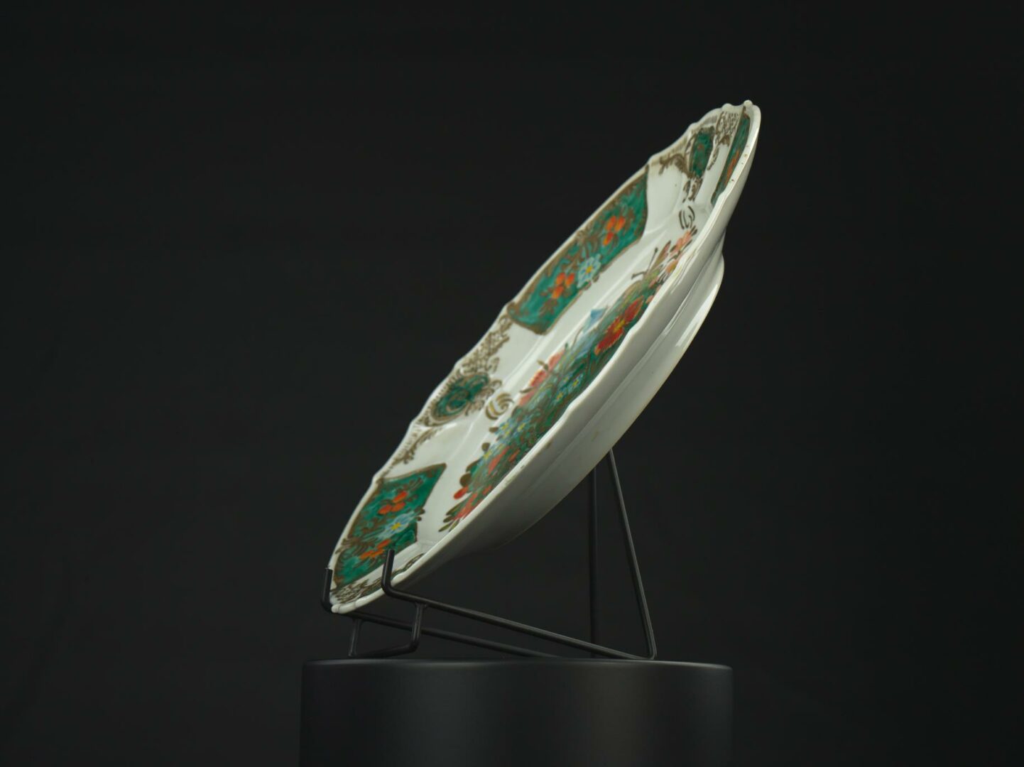 Tanier porcelánový maľovaný. Dekor: v strede kvety vo váze a motýľ, po okraji ornamentálne spracované kvetinové motívy. Bez značenia.