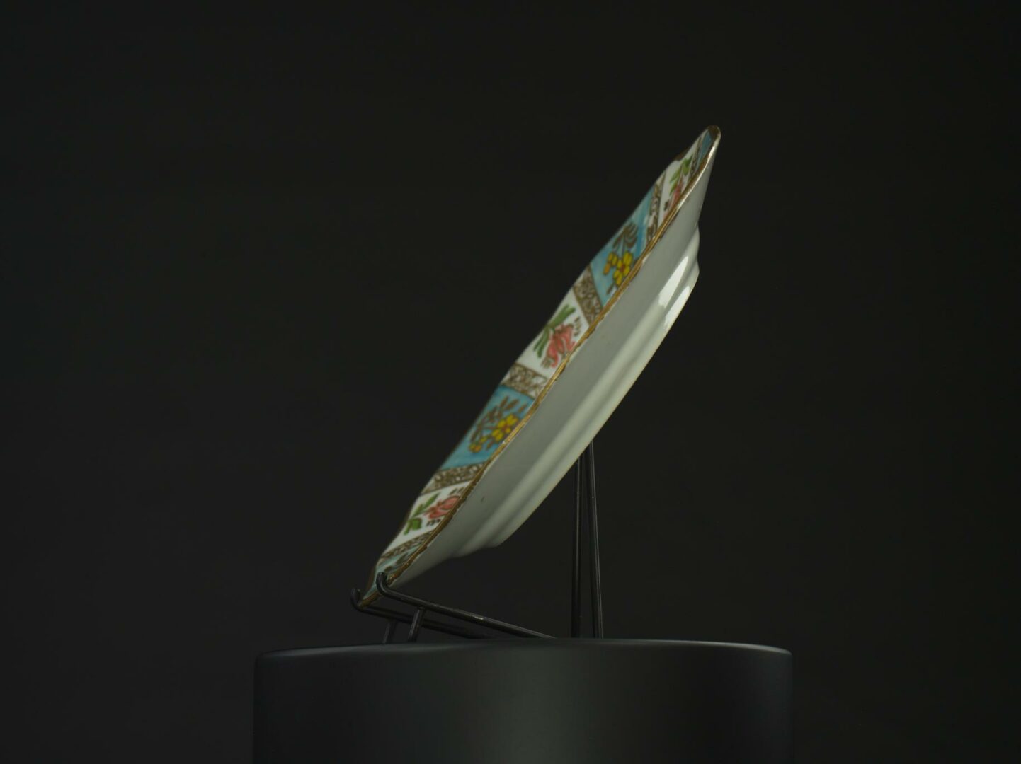 Tanier porcelánový maľovaný. Dekor: v strede vták a kvety, po okraji ornamentálne spracované kvetinové motívy. Bez značenia.