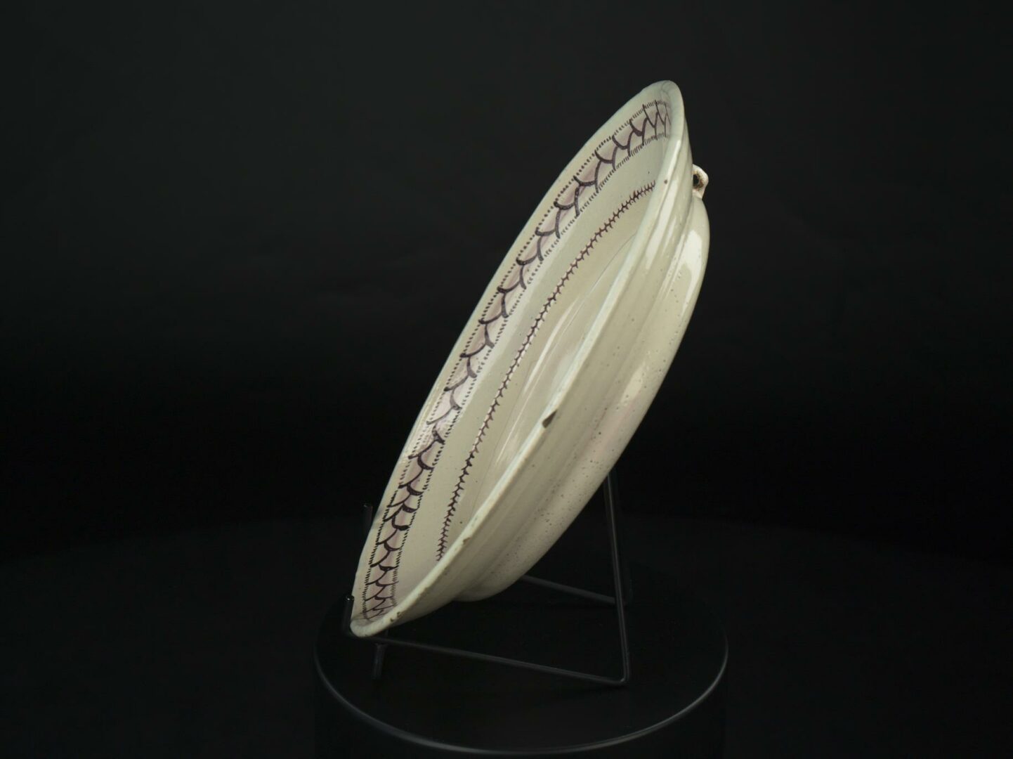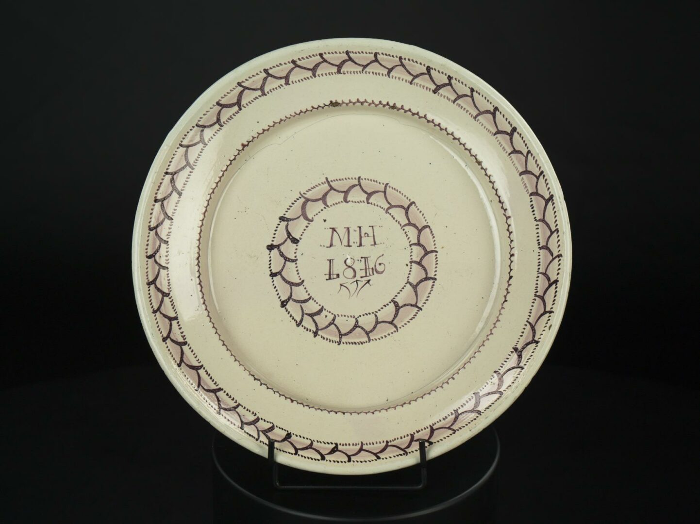 Tanier z bledej hliny, točený na kruhu. Nízke steny sú pod okrajom mierne vyhnuté. Dekor: na dne iniciály MH a datovanie 1816, okolo venček, po obvode venček. Farebnosť: mangánová fialová, biela podkladová glazúra. Bez značenia.