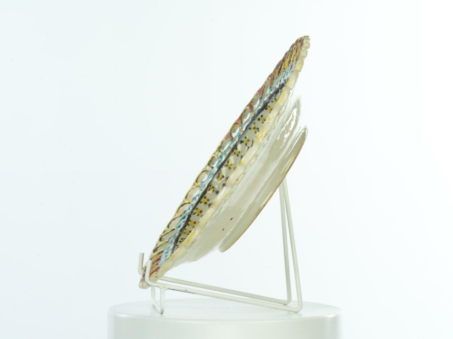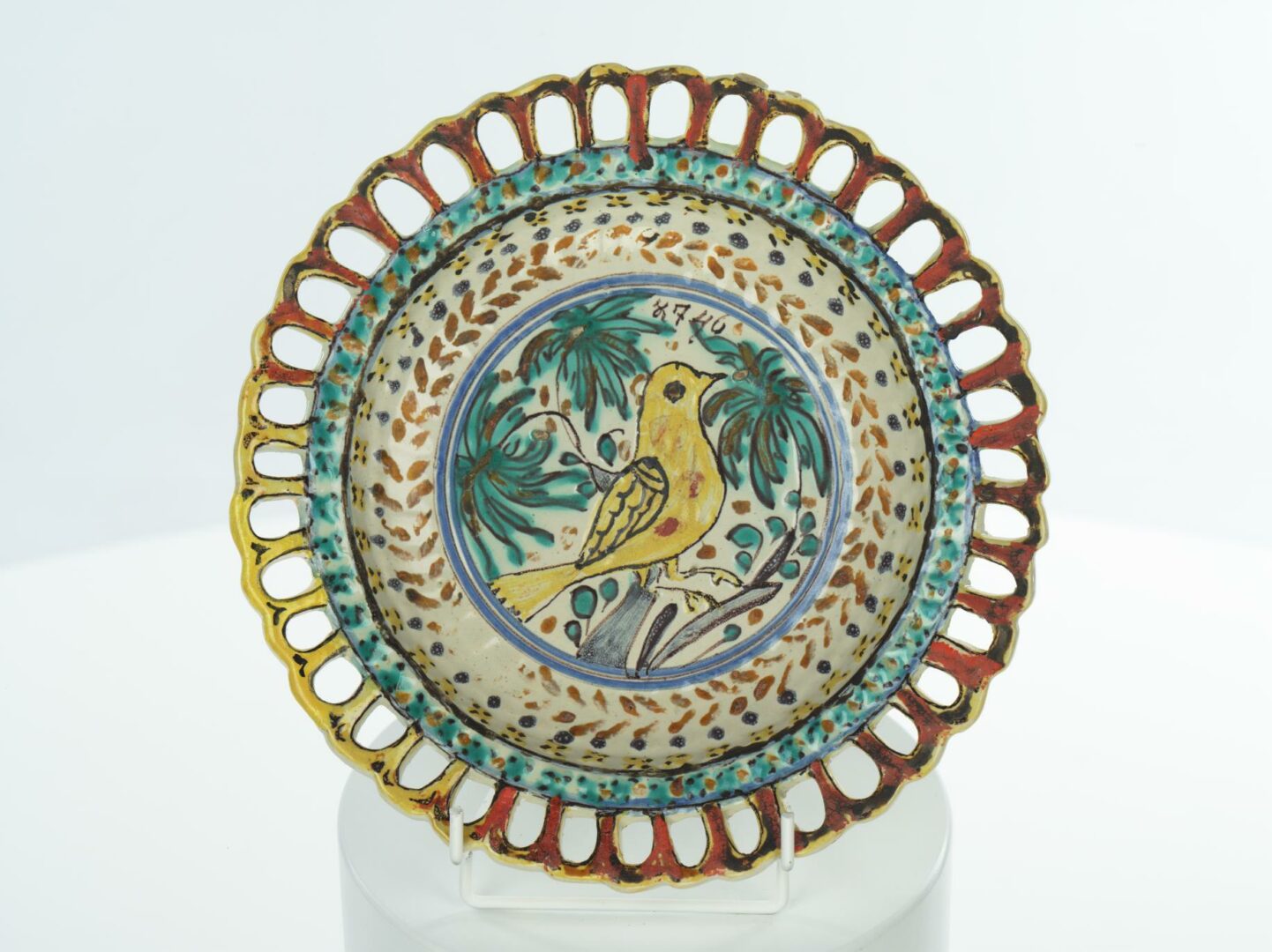 Tanier z bledej hliny, točený na kruhu. Nízke steny sú pod okrajom mierne vyhnuté, okraj je vyrezávaný /perforovaný/ v tvare oblúčikov. Dekor: na dne žltý vtáčik a stromčeky, okolo štylizovaný rastlinný dekor /bodky ako kvety, čiarky ako lístky/. Nad vtáčikom datovanie 1746. Farebnosť: žltá, modrá, zelená, hnedá, čierna kontúra. Biela podkladová glazúra. Bez značenia.