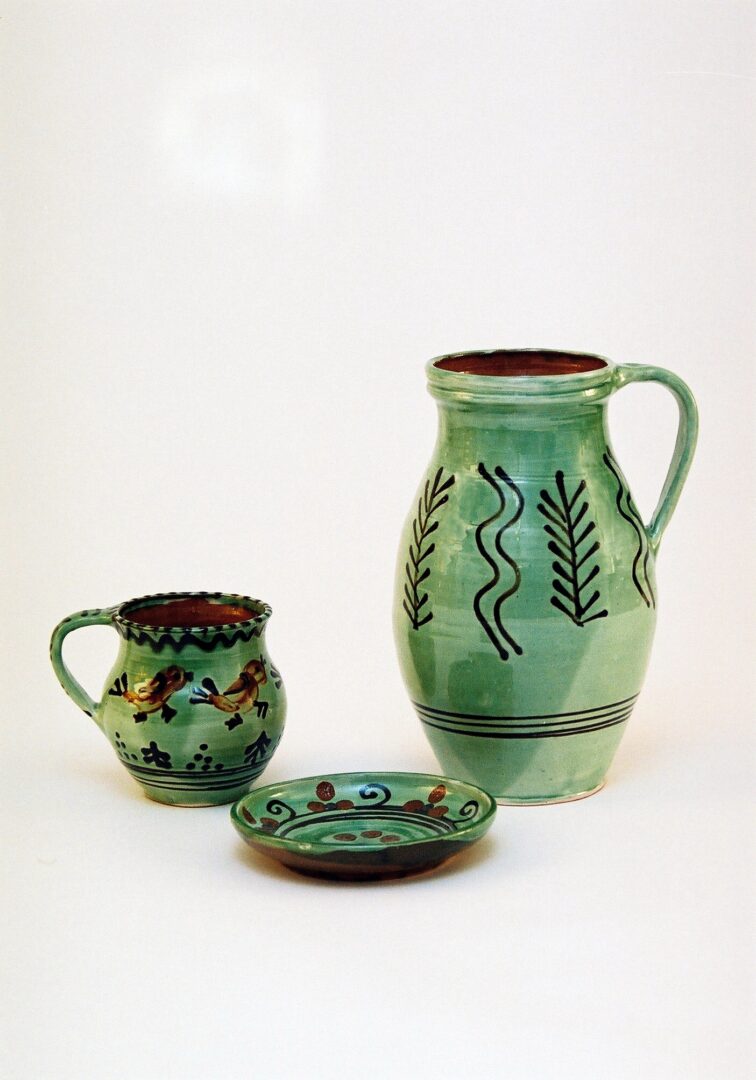 Ručne točený na hrnčierskom hruhu, poliaty bielou hlinkou, maľovaný farebný motív vtáčika, alebo kvietka, transparentná zelená glazúra. Na obrázku v strede.