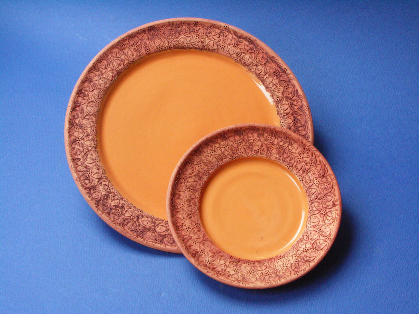 Ručne točený na hrnčiarskom kruhuz bledej hliny, okraj je zdobený rytým jemným rastlinným vzorom, prekrytým čevenohnedou hlinkou, na dne transparentná bezfarebná glazúra.