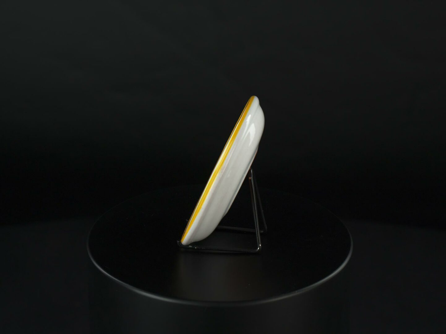 Tanierik z červenej hliny, točený na kruhu. Nízke steny sú pod okrajom mierne vyduté. Farebnosť: žltý okraj, biela glazúra. Bez dekoru.