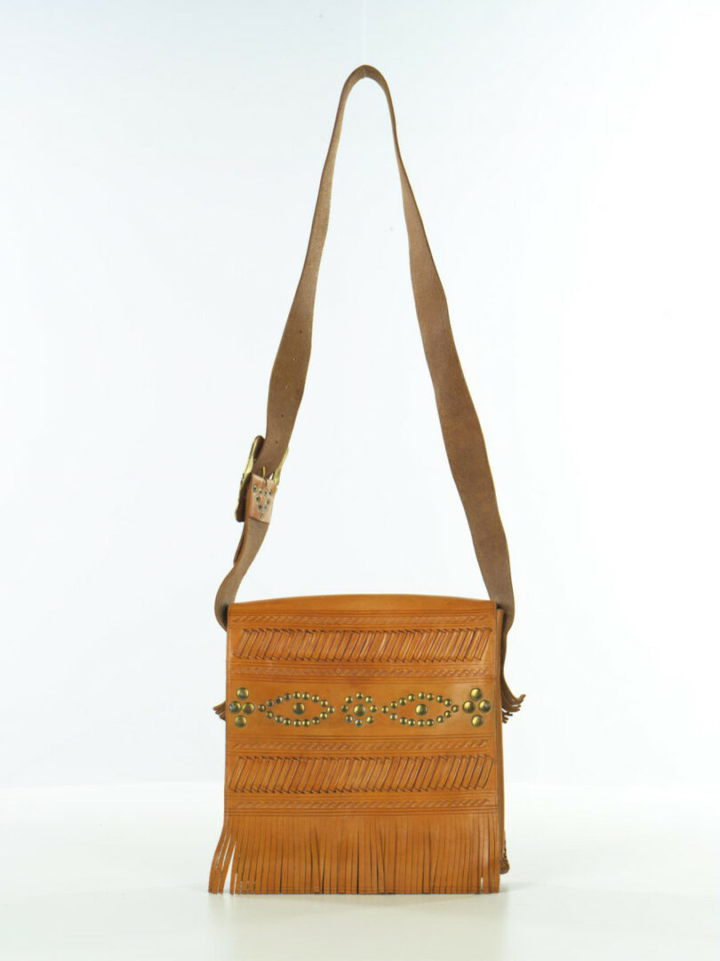 Taška z hovädzej kože s remeňom na nosenie cez plece. Chlopňa (príchlopok) je zdobený strihanými strapcami, cvočkami (cvoky), remienkovým prešívaním, zdobený rádlikovou vzorkou a obťahovákom za tepla. Okraj kapsy je prešívaný tenkým remienkom na retiazku. Na rememi je mosadzná gravírovaná pracka.
